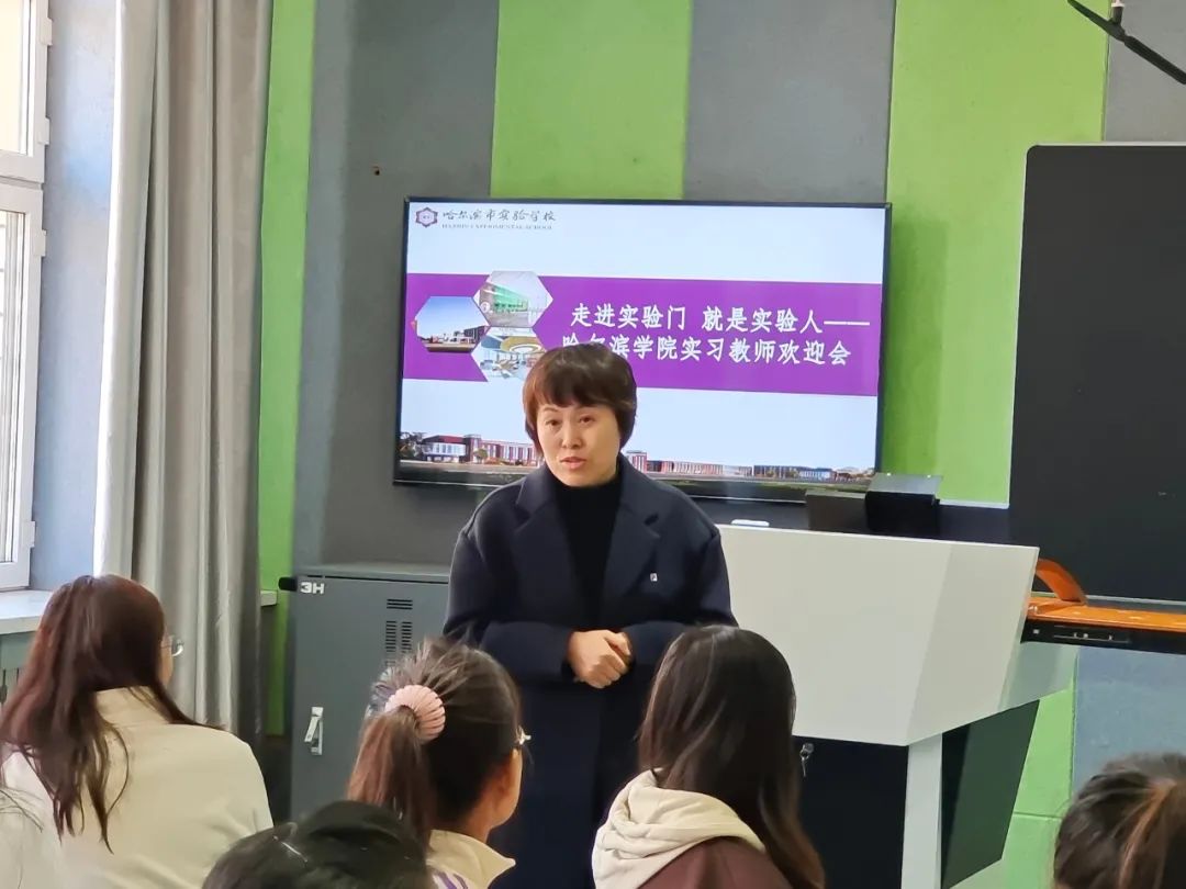 哈尔滨学院带队教师林晓颖副教授也进行了发言,感谢实验学校为哈尔滨学院提供了良好的见习平台,所有见习生一要严格执行实验学校各项规章制度,在见习中要多沟通,懂分寸,积极参与学校的各项教育教学任务,博观约取,勤学好问,真正做到见习期间以一名“教师”的身份要求自己,学会双重身份的转换;二要积极配合指导教师的各项工作,踏实努力,共同钻研,展现哈学院学子风采;三是希望见习教师珍惜在实验学校见习的宝贵机会,以谦虚的心态,积极投入到见习工作中,不负此行,不负韶华。