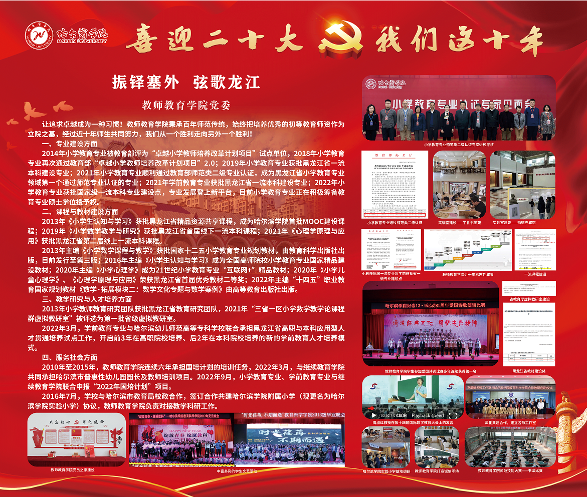 2014年小学教育专业被教育部评为“卓越小学教师培养改革计划项目”试点单位,2018年小学教育专业再次通过教育部“卓越小学教师培养改革计划项目”2.0;2019年小学教育专业获批黑龙江省一流本科建设专业;2021年小学教育专业顺利通过教育部师范类二级专业认证,成为黑龙江省小学教育专业领域第一个通过师范专业认证的专业;2021年学前教育专业获批黑龙江省一流本科建设专业;2022年小学教育专业获批国家级一流本科专业建设点,专业发展登上新平台,目前小学教育专业正在积极筹备教育专业硕士学位授予权。