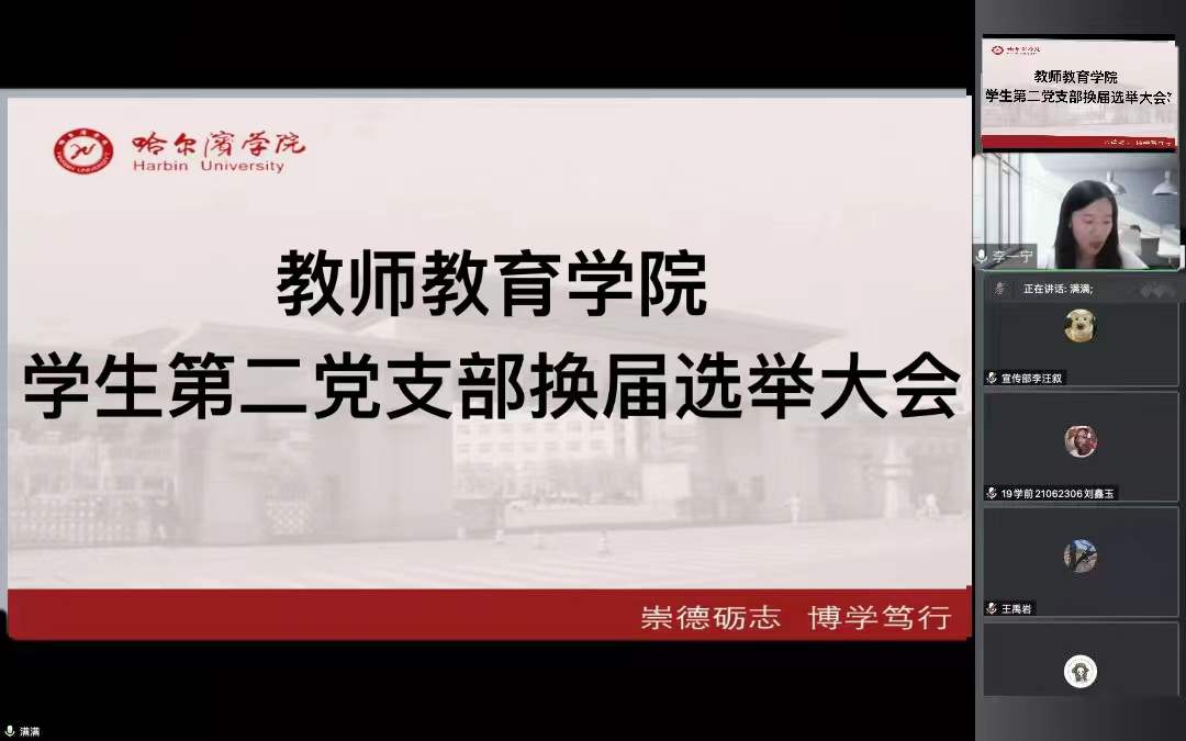 为落实党内民主制度,保障广大党员民主权利,按照校党委组织部及院党委的统一部署和要求,教师教育学院学生第一、第二党支部分别于5月27日、28日召开线上换届选举大会。出席换届大会的有院党委书记杨晓静、党委委员副处级辅导员孙华、学生第一党支部书记张满,学生第二党支部书记李一宁,各支部全体正式党员及预备党员。选举大会分别由学生第一党支部书记张满、学生第二党支部书记李一宁主持。
