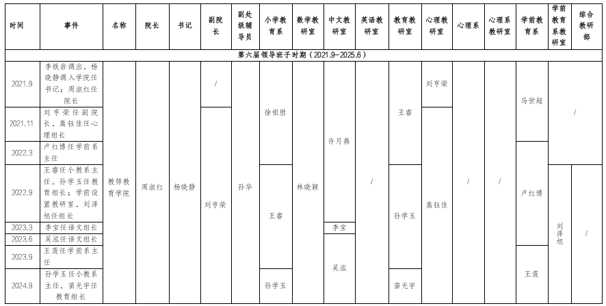 2021年 9 月,在第六届中层领导班子换届改选中,周淑红担任院长兼党委副书记,杨晓静由文法学院调入担任党委书记。2021年 11 月,刘亨荣担任副院长。孙华为副处级辅导员,为班子成员。2021 年 11 月,嵩钰佳担任教工党支部书记。小学教育专业因为徐祖胜调离学院到常熟理工学院,王睿调离学院到哈尔滨师范大学,徐祖胜(2014.9-2022.9)、王睿(2022.9-2024.9)、孙学玉(2024.9-)接续担任小学教育专业系主任。马世超(2020.9-2021.12)、卢红博(2022.3-2023.9)、王菠 (2023.9-)担任学前教育专业系主任;随着学前教育专业教师数量增加,学院决定自2022 年 9 月起设立学前教育专业教研室主任,刘 泽旭担任首位教研室主任。