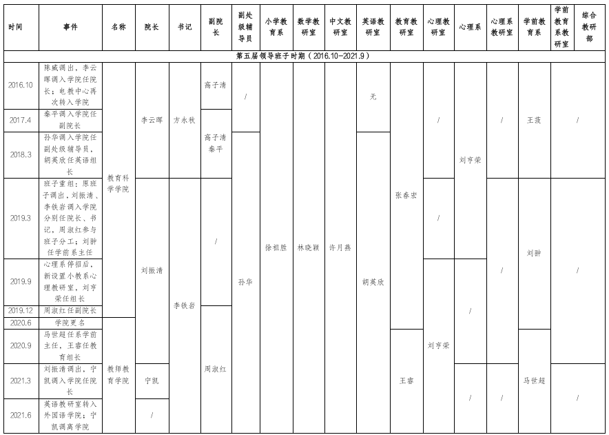 2016 年 10 月,在第五届中层领导班子换届改选中,陈威院长调任教师教学发展中心主任,李云晖由教务处调入担任院长,方永秋担 任书记、高子清担任副院长。2017 年 4 月,秦平由督导处调入担任副院长。2018 年 3 月,孙华作为副处级辅导员由文法学院调入成为班子成员。2019 年 3 月,教育科学学院班子进行调整,李云晖调到信息工程学院,方永秋调到地理与旅游学院,高子清调到经济管理学院,秦平调到科技处。与此同时为了更好地迎接专业认证,重组教育科学学院班子,刘振清由校办公室调入学院担任院长,李铁岩由组织部调入学院担任书记,周淑红作为小学教育专业带头人,兼管实践教学工作。2019 年 10 月,周淑红担任副院长。2021 年 3 月,刘振清院长调任学校党政办公室主任,宁凯由音乐与舞蹈学院调入担任院长。 2021年 6 月,宁凯调任哈尔滨科学技术职业学院副校长,离开哈尔滨学院。徐祖胜担任小学教育专业系主任,王菠(2016.9-2019.3)、刘翀(2019.3-2020.9)、马世超(2020.9-)担任学前专业系主任。刘亨荣(2015.9-2019.7)担任心理学系主任。