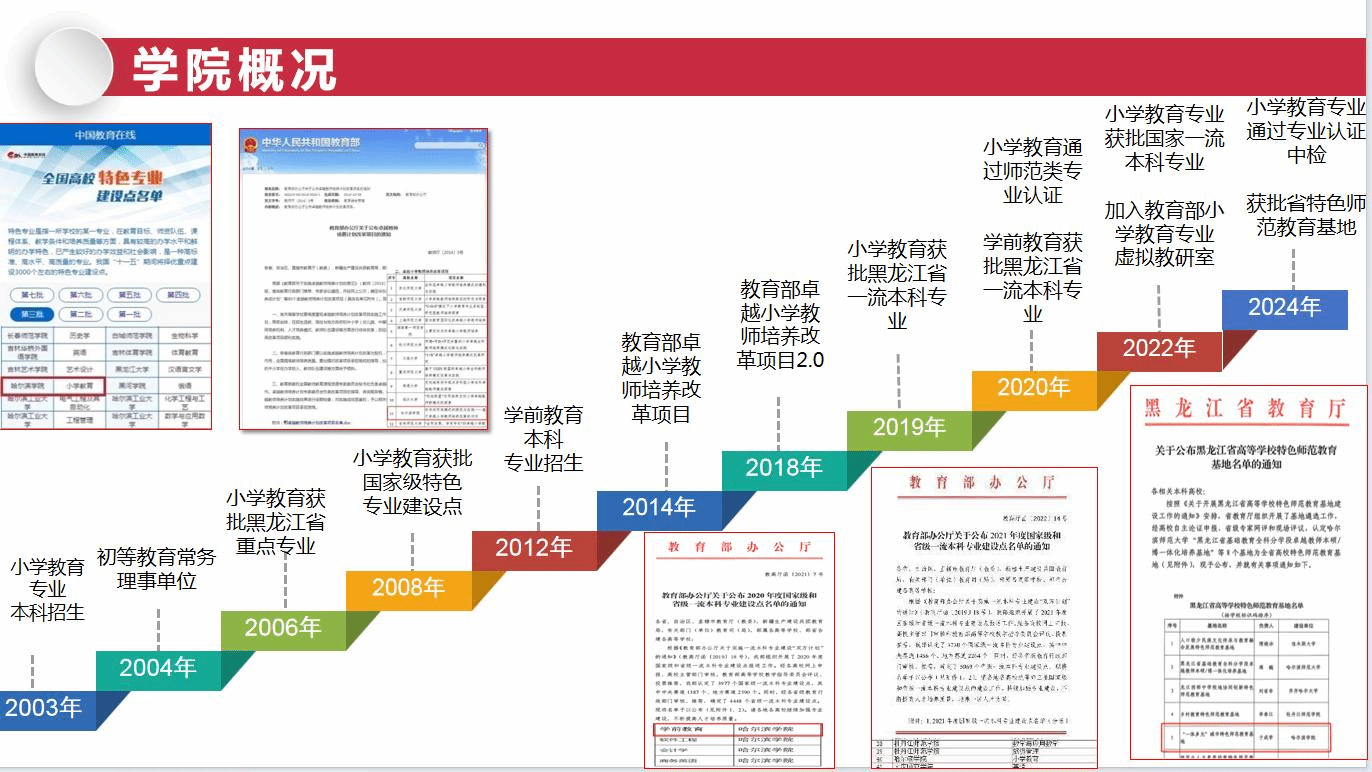 学院与政府、教研部门、小学及幼儿园建立“UGIS ”四位一体协同育人培养模式,与哈尔滨市教育研究院、名优小学双向互聘、共建 师范生特色课程,合作课题研究。提倡“实习就业一体化 ”,通过师范生专业技能考核及展演、小学校长论坛、幼儿园园长论坛、基础教育讲座等主题活动,打造特色师范教育人才培养活动品牌。学生参加 “华文杯 ”“京师杯 ”“全国师范院校初教系统学生数学、信息技术 录像课评比 ”等大赛,近 5 年获得国家级比赛一、二等奖 100 余项。