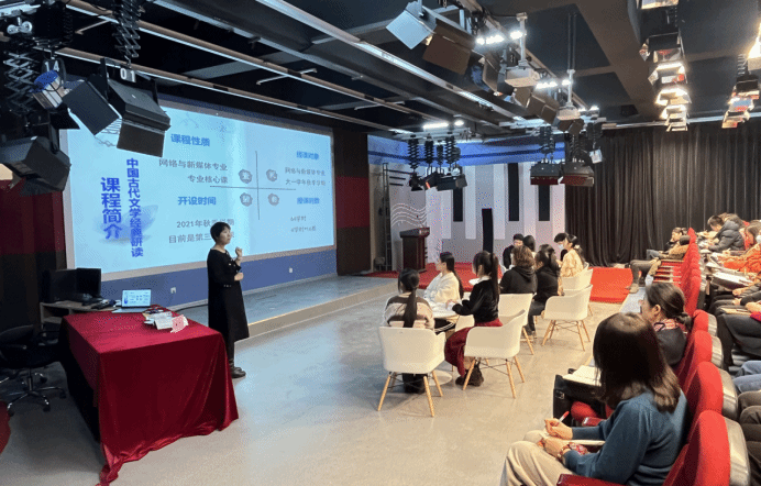 公开课教学观摩以网络新媒体专业核心课《中国古代文学经典研读》的一个学时为依托,包括说课、讲课和教学反思三个环节。在说课环节,姚远围绕课程概况和学情以及本次课的教学目标、内容、重难点等,介绍了课程教学设计及本节课教学任务的解决策略。在授课环节,姚远与学生还原实体教学现场,从讲评线上学习成果导入新课,到理论讲授与小组合作探究,再到课堂总结及课后拓展,完整地展示了一堂内容丰富、生动精彩的诗词鉴赏课。教学反思过程中,姚远对教学流程进行梳理,指出两点教学方法创新,并根据学生的表现总结改进之处。