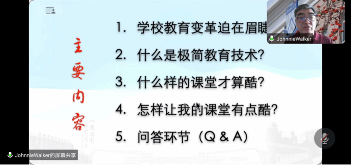 焦建利以一段精彩的短视频开篇,引发参会教师对学校教育教学改革深层思考,强调学校教育教学改革迫在眉睫。讲座中,他阐释了极简教育技术的6大特征,即功能单一不简单、学习成本极低、用户上手快、使用门槛低、便捷易用体验好、使用效果立竿见影;指出,“有趣、有效、高效、生成性、互动与参与”是打造好课堂必不可少的五个要素,针对这五个要素的实现,给教师提出了可行性的建议。他提出,技术最核心的两个目标是“减负”和“增效”,要用极简技术让课堂有点酷。最后,焦建利通过ketang.cool网址为新教师演示了击鼓传花、纸条范、快抢等模块的使用方法,其中穿插了多个精彩短视频,引发参会教师深度思考,如何遵循极简主义原理,从复杂中寻找最本质的东西。