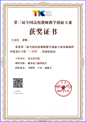 《概率论与数理统计》课程团队经过六年多“阶梯式自主建构人才培养模式”研究与实践,对课程进行“夯实基础→拓宽应用→探索创新”三级阶梯式教学设计,以“弱理强用、引工入理、工题理化”课程内容重构、“两教两学”教学方法创新他“智能化、多元化、精细化、高频化”考核评价改革,探索出“M-S-F-P”智慧教学实践路径,致力于解决教学痛点,建设与新工科发展相适应的优质课程,为培养具有国际视野、能应对新一轮科技革命和产业变革的应用创新型卓越工程技术人才服务。赛后,主讲教师王永红表示,“从校赛、省赛到国赛,一路走来,最大的收获是成长,既触摸到了教学学术最前沿,又更加明确了未来教学的努力方向。最自豪的是,能在国家级教学赛事上展示哈尔滨学院教师教学创新成果;最幸福的是,参赛过程中得到了学校的高度重视,教师教学发展中心、教务处等职能部门和信息工程学院、土木建筑工程学院的大力支持,以及课程团队教师们的密切配合。在未来的教学路上,我必将此生献教育,钻研教学、创新教学、潜心育人!”