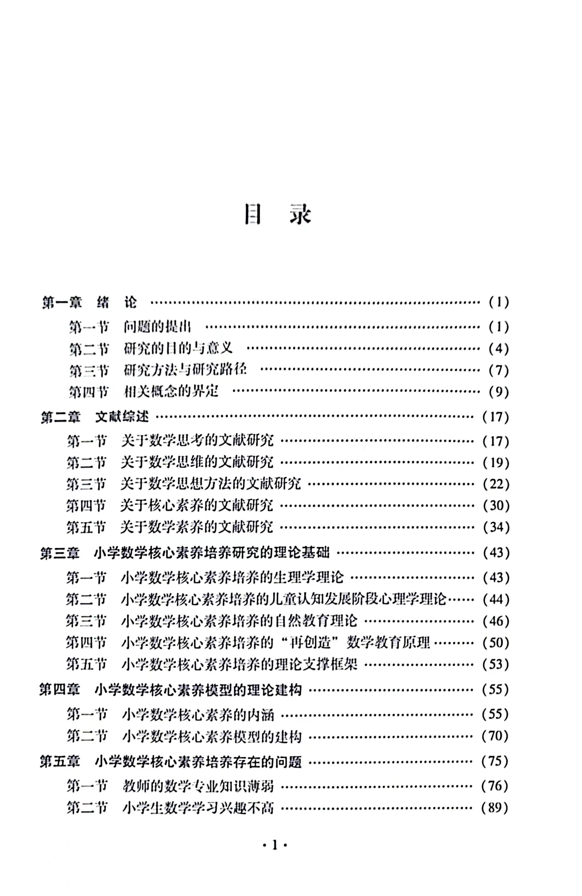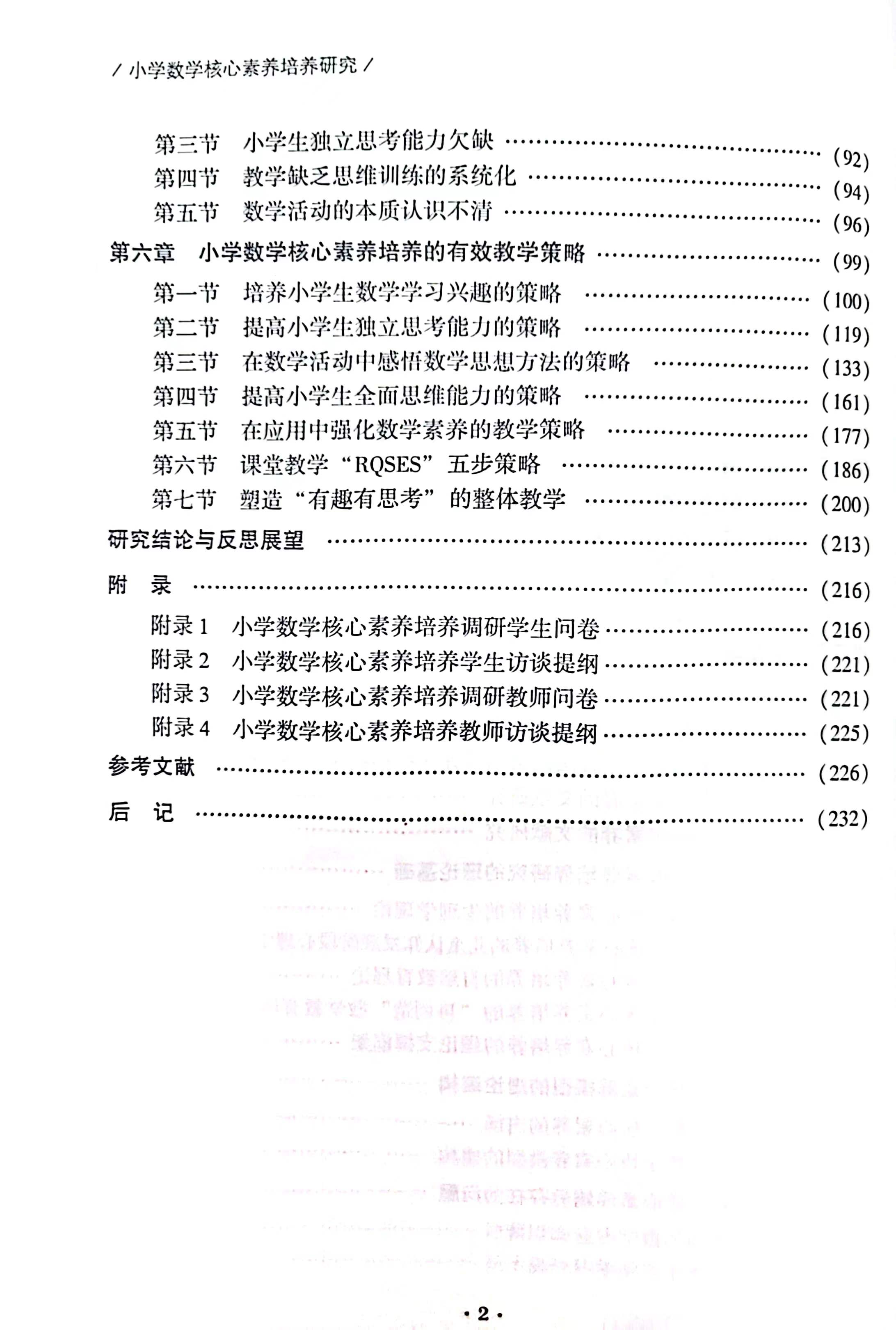 第五章:存在问题。为清晰把握小学数学核心素养培养的现状,在大量听课基础上,结合学生和教师两方面进行了问卷调查和访谈调查,指出了小学数学核心素养培养存在的问题。