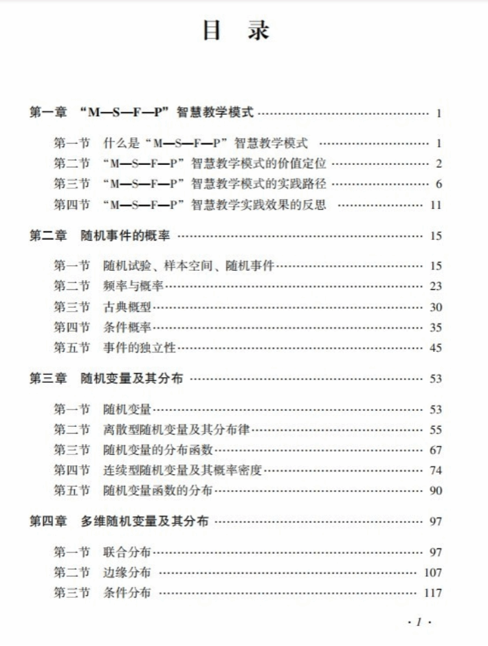 为了让这门课更好地服务于新工科建设,本书作者以教学模式改革驱动课程目标、课程内容和学生评价方式改革。从2016年开始立项研究基于慕课的翻转课堂教学;2018年开始研究新工科概率论与数理统计课程O2O混合式教学。几年的理论与实践研究中,先后尝试了MOOC+SPOC+翻转课堂教学、MOOC+SPOC+对分课堂教学、SPOC+翻转课堂+对分课堂教学+MOOC等线上线下混合式教学模式,创造性地提出了“M-S-F-P”智慧教学模式,实现数字化转型。