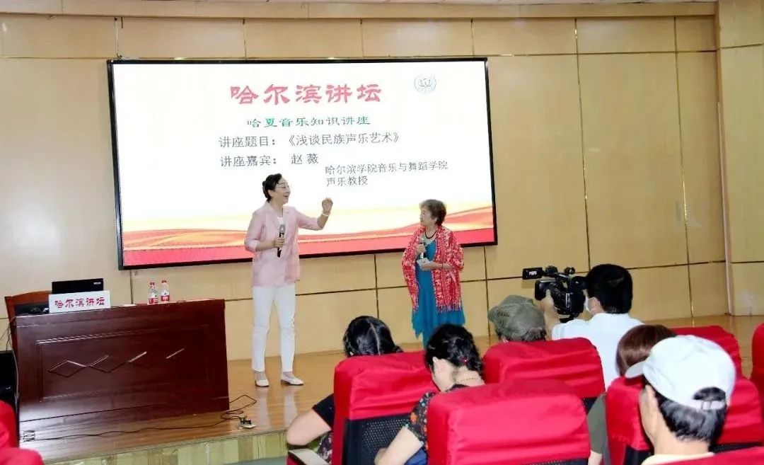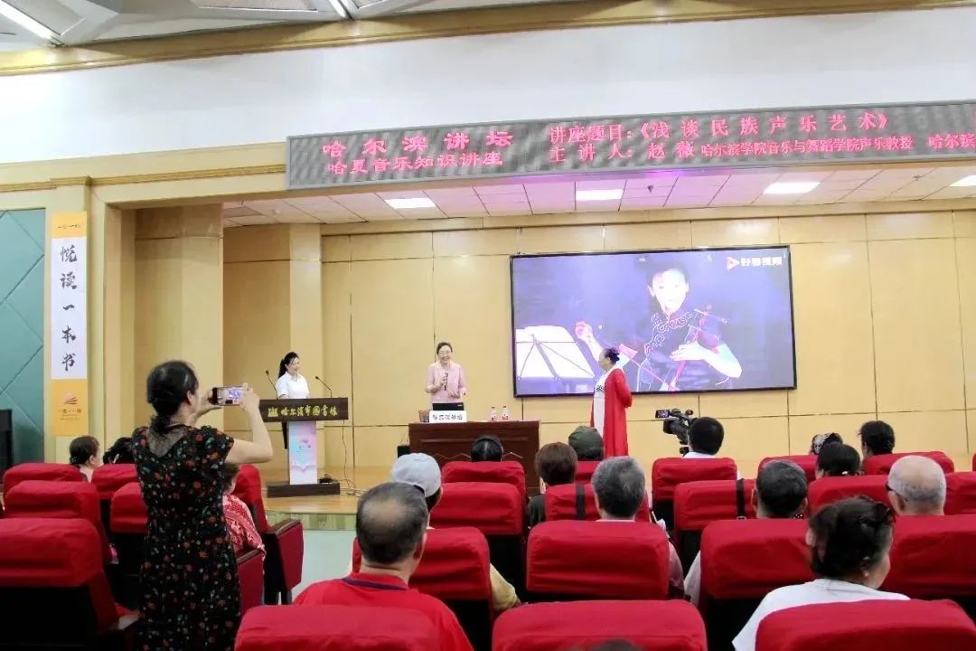 此次讲座邀请的是哈尔滨学院音乐与舞蹈学院赵薇教授,讲座题目为:《浅谈民族声乐艺术》。讲座中赵薇教授首先强调要提高音乐的审美能力,注重演唱风格要求,时代与个人风格特点;接下来讲解演唱的规范化训练:包括民族歌曲的演唱风格,中国唱法和西洋唱法的共性和特性;介绍民族歌曲的演唱风格,强调要打好声音基础;讲座的最后部分赵薇教授为市民介绍了几种声乐教学方法:启发式教学法、想象式教学法、比喻式教学法等。赵薇教授的讲座结合多年教学经验,理论联系实际,穿插播放名家演唱歌曲的视频分析解读,使讲座生动活泼,通俗易懂。赵薇教授还和听众进行了交流互动,在听众演唱歌曲后给予点评,使演唱者获益不浅。讲座现场气氛热烈,大家纷纷举起手机记录这难忘时刻。最后,赵薇教授亲自演唱了维吾尔族民歌《一杯美酒》,歌声动人心弦,博得阵阵掌声。