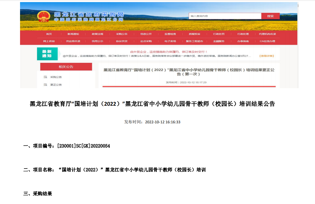 (文/姜淑媛)2022年10月12日,我校继续教育学院喜获2022年“国培计划”黑龙江省中小学幼儿园骨干教师(校园长)培训项目的第16包“哈大齐工业走廊市辖区乡村教师送教下乡”和第18包“农村中小学骨干教师素养提升等”两包标的中标的通知。