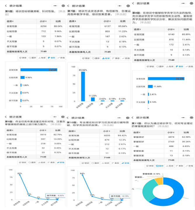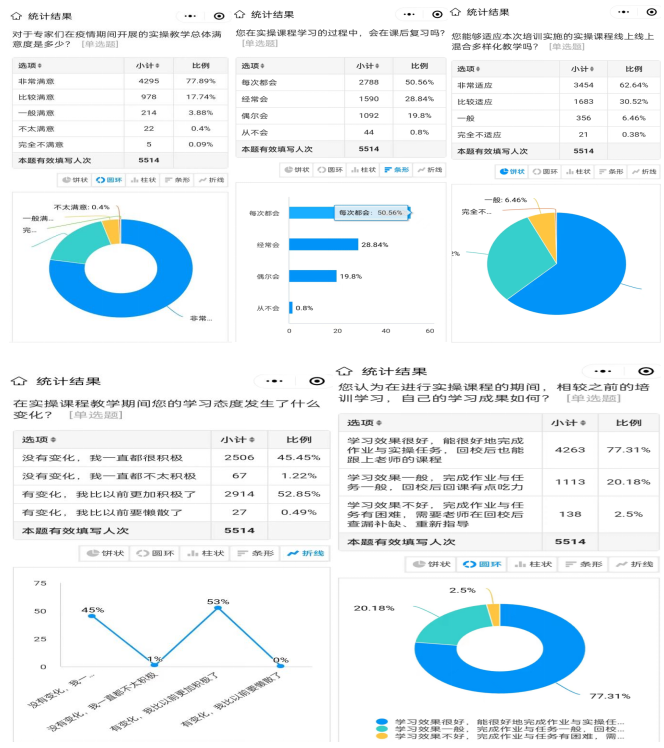 问卷内容主要包括培训目标实现、学习效果转变、培训内容充实度、培训方式实效性,对疫情期间开展实操教学及教学方式的满意度、辅导答疑和任务布置针对性等近30项内容的调查了解,专业理论课程培训情况和专业实操课程培训情况两项问卷调查中,满意度均达到95%以上。
