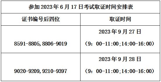 请各位考生严格按照上表通知时间段内领取,领取时请提前说出证书编号后四位以便查找,并携带本人身份证,异地考生他人代取请携带考生本人身份证复印件及代取人身份证。