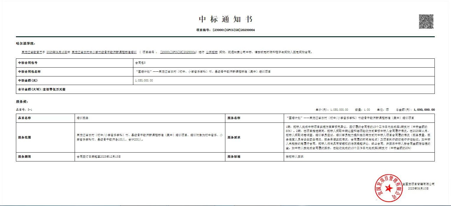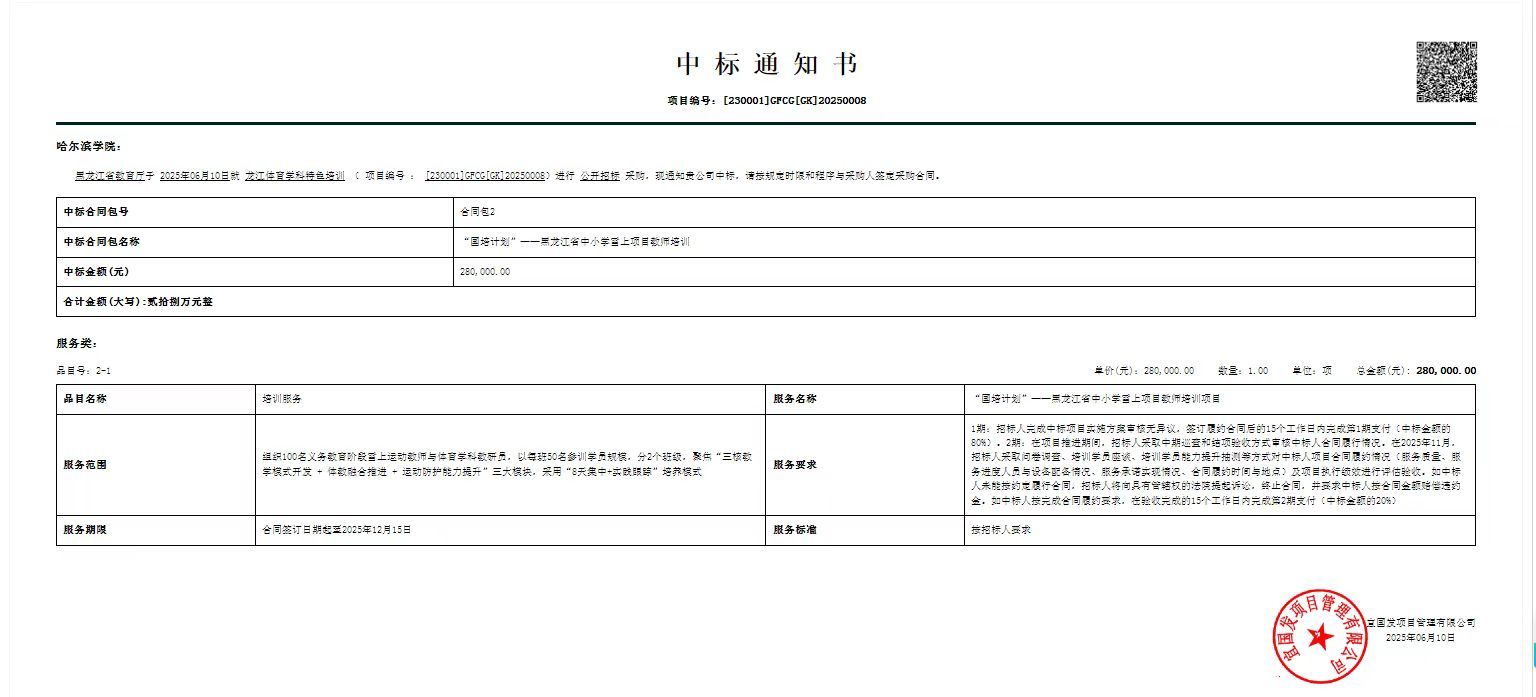 (文/原振莹)日前,我校在2025年度黑龙江省“国培计划”项目竞标中成功竞得两个项目,喜传捷报。中标黑龙江省农村(初中、小学音乐学科)市、县级骨干教师新课程标准(集中)培训项目和黑龙江省中小学雪上项目教师培训,成为两个培训项目的承培单位,中标金额共133万元。