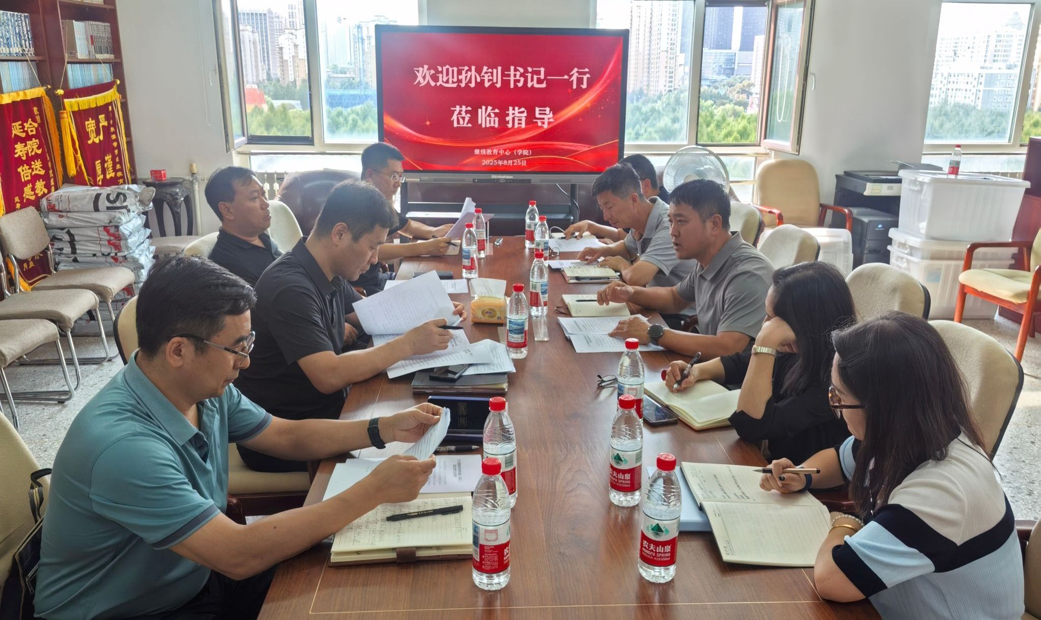 2025年8月26日,学校党委书记孙钊一行到继续教育学院调研指导工作,听取学院工作汇报并作重要指示。副校长于少鹏、纪委书记杨铁岩、党政办公室主任常征陪同,继续教育学院院长吴立刚、副院长李刚及各科室负责人参加会议。