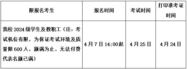 2.本次考试只针对本校2024级学生及教职工开放,如有校外人员或其他年级学生参与报名,经核查后,不予考试且不予退费,后果自负。