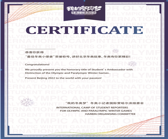 精彩纷呈的集训活动助力小记者们站上国际的舞台,锻炼自我、表达自我、超越自我,在比赛中收获,在历练中成长。让我们一起圆梦2022,用国际语言向世界讲述中国故事、讲述黑龙江故事!青春激昂的冬奥梦从这里出发吧!加油,小记者们!让我们共同践行 “卓越、尊重、友谊”的奥林匹克核心价值观!
