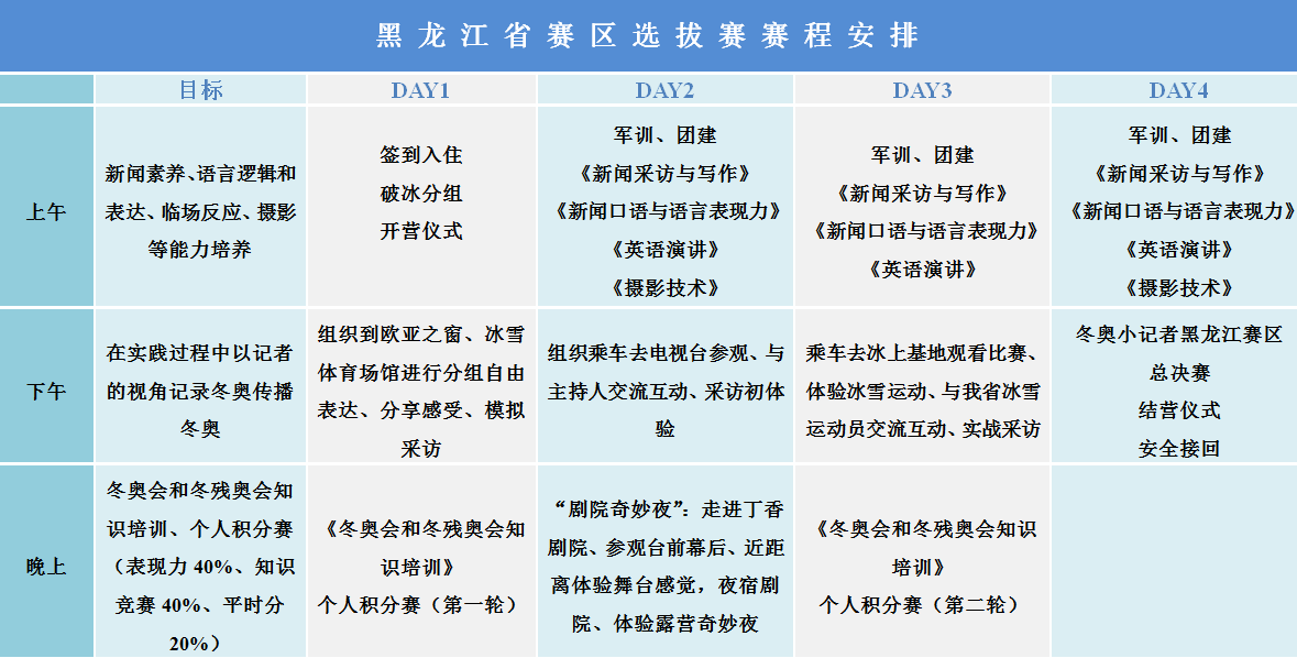 黑龙江省是冰雪运动的大本营,两百多万青少年从小就在冰雪运动的熏陶下成长,领略了冰雪运动的无限魅力。本次参与“冬奥小记者”的选拔,不仅是圆自己的奥运梦,更是为家庭、学校、家乡争光,代表黑龙江青少年,观看世界顶级运动员在比赛场上的英姿,与各国运动员进行交流采访,与著名记者一起报道赛事,参与冬奥主题节目录制。作为一名“冬奥小记者”在冬奥会赛场工作的经历将成为你一生闪耀的徽章。