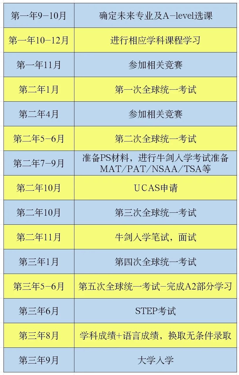 这是一个完整的结合高考学习与备考A-level的两年直升课程时间规划(仅供参考),有能力的同学,可以根据自己的情况,适当压缩学时时间,尽快考出A-level并申请全球名校,争取早日出国。