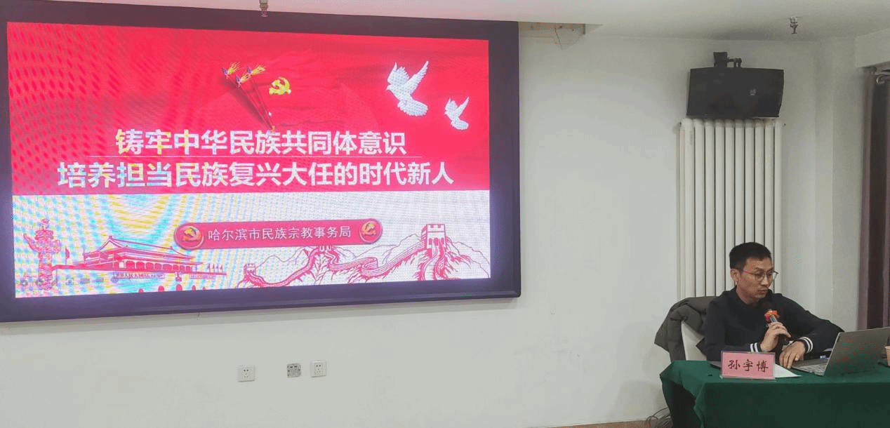 11月29日下午哈尔滨市民族宗教事务局民族工作处二级调研员孙宇博为学员作《铸牢中华民族共同体意识培养担当民族复兴大任时代新人》专题讲座。全面归纳总结了铸牢中华民族共同体意识提出的时代背景、重大意义和工作任务。多角度以铸牢中华民族共同体意识为主线,开创新时代党的民族工作高质量发展新局面有了更加全面的认识和更加深刻的理解。