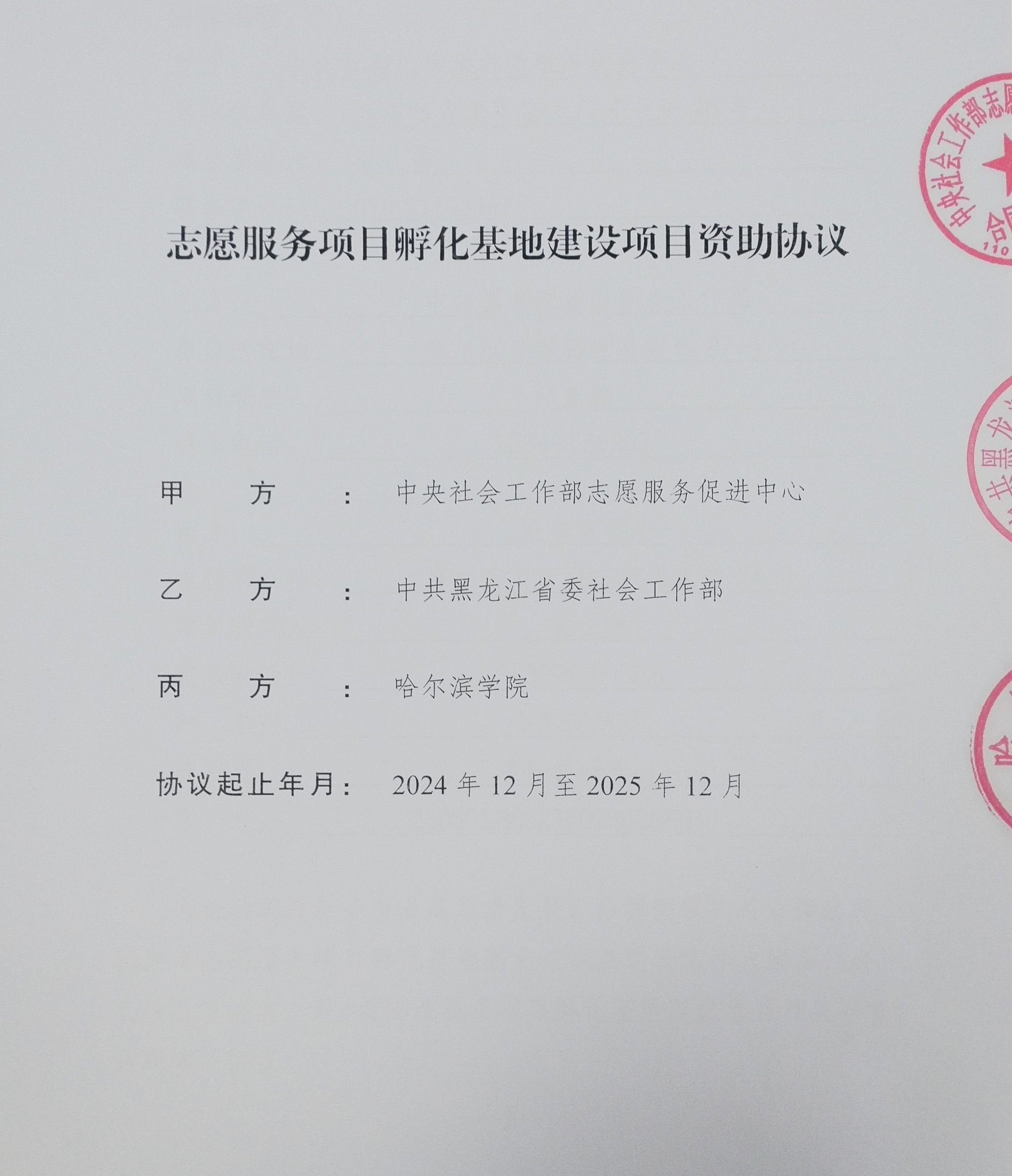 近日,为积极响应国家关于推动志愿服务事业高质量发展的号召,中央社会工作部志愿服务促进中心、中共黑龙江省委社会工作部与哈尔滨学院共同签署了志愿服务项目孵化基地建设项目资助协议。此协议依据《志愿服务项目孵化基地黑龙江试点建设工作方案》的相关精神,旨在通过整合政府、企业和社会资源,为志愿服务项目提供全方位、深层次的支持、服务和培训,推动志愿服务项目的科学化、规范化、专业化发展。