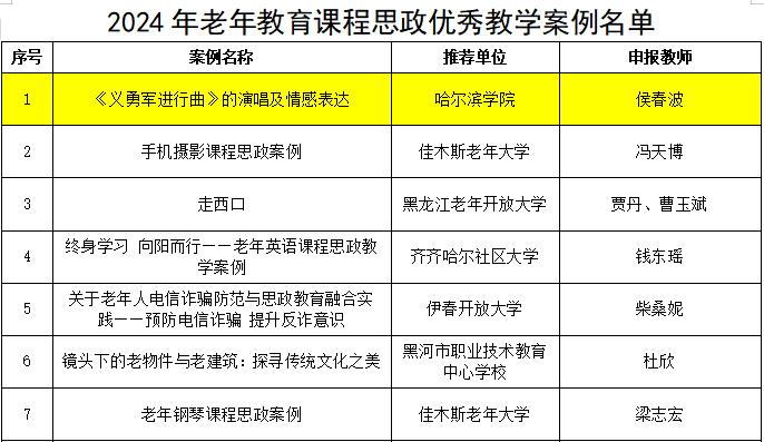 近日,黑龙江省教育厅公布了2024年全省老年教育课程思政优秀教学案例、教学成果展、老年教育学习基地以及优质老年大学等多项评审结果,我校继续教育学院在此次评选中表现卓越,收获颇丰,充分展现出了在老年教育领域的强劲实力与积极贡献。