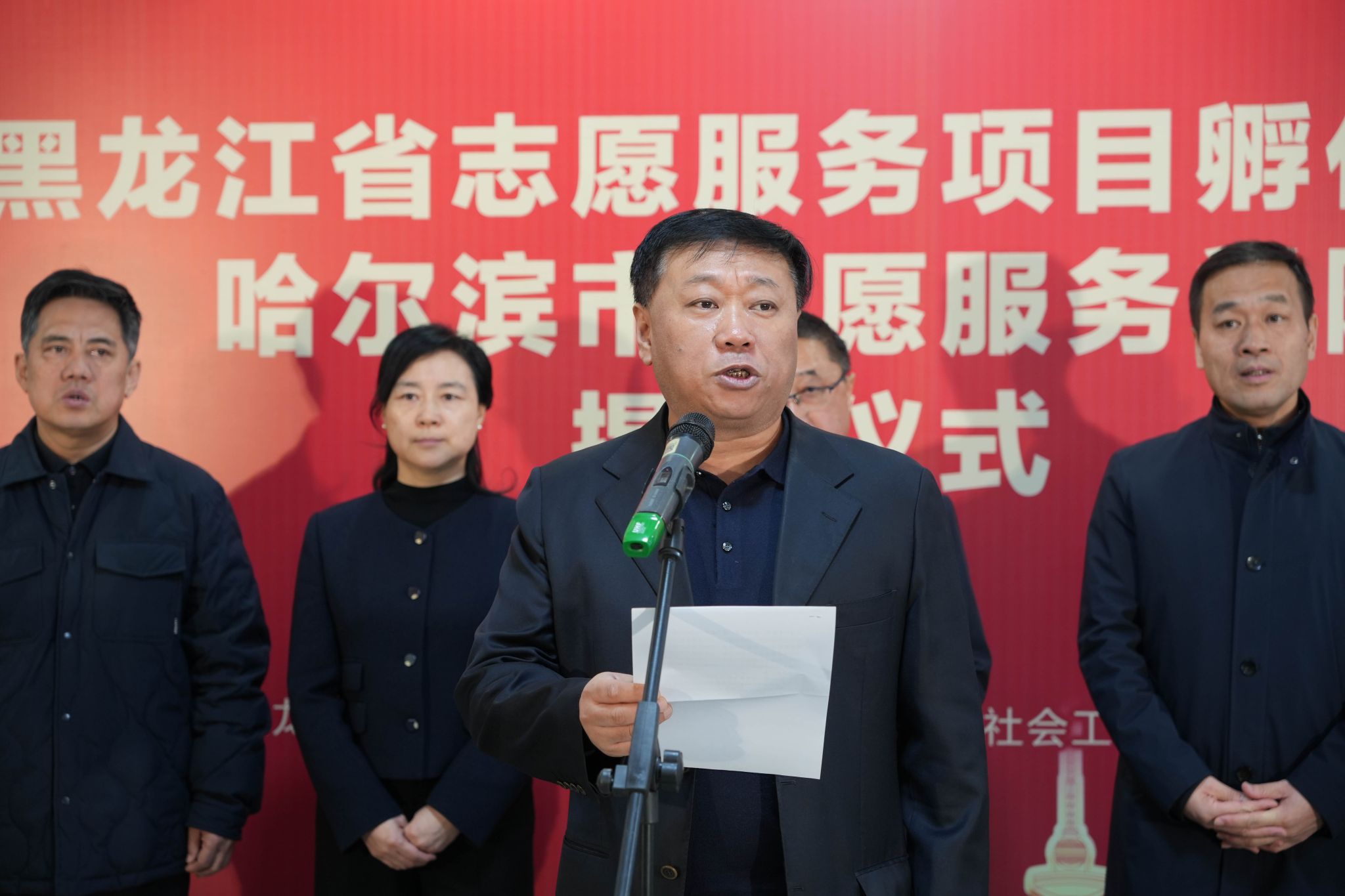 孙镝飞代表省委社会工作部讲话。他指出,建设黑龙江省志愿服务项目孵化基地,是贯彻落实中央关于志愿服务工作决策部署的重要举措,是推动全省志愿服务制度化、专业化、品牌化发展的战略抓手。希望哈尔滨学院立足高校智库优势,强化资源整合、创新服务模式、提升孵化效能,努力把基地建设成为志愿服务人才培养、项目培育、实践创新的坚实阵地,为新时代龙江文明实践和社会治理现代化提供坚实支撑。