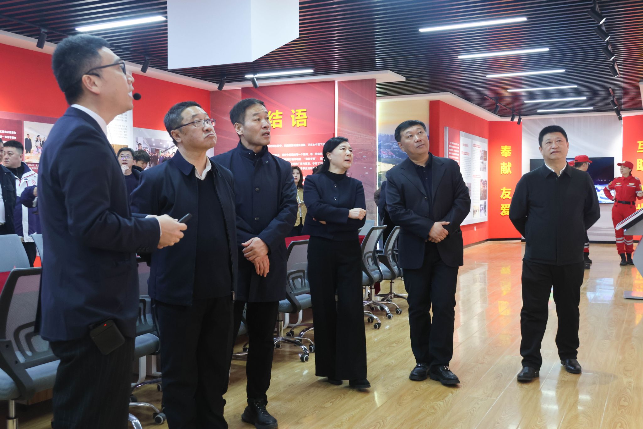 随后,全体人员实地参观基地展厅,详细了解基地功能布局、项目培育及志愿服务孵化网络平台建设情况。孙钊就基地建设运行、功能发挥、长效发展等工作作出现场指导并提出明确要求。他指出,学校志愿服务工作要突破空间壁垒、拓展实践阵地,以哈尔滨学院为核心支点,围绕校园红色教育文化主题和场馆资源,推动志愿服务项目孵化从固定场馆走向社会一线。要建立综合志愿服务项目特色体系,树立国内优质志愿服务项目品牌,引领广大师生主动投身志愿服务实践,让志愿精神在社会各界广泛传递、蔚然成风。
