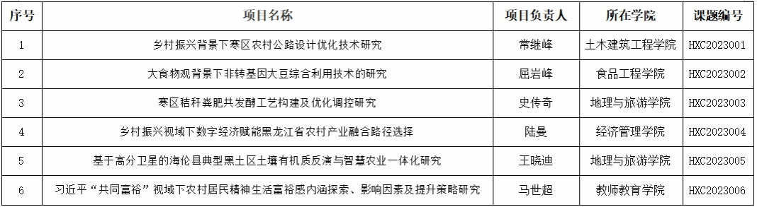 2023年哈尔滨学院“乡村振兴博士科研基金专项”课题立项一览表