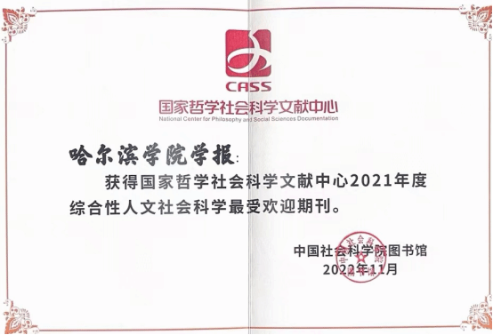 2023年1月,中国社会科学院国家哲学社会科学文献中心发布了《国家哲学社会科学文献中心中文期刊用户关注度报告(2021年度)》,《哈尔滨学院学报》荣获“综合性人文社会科学最受欢迎期刊”。