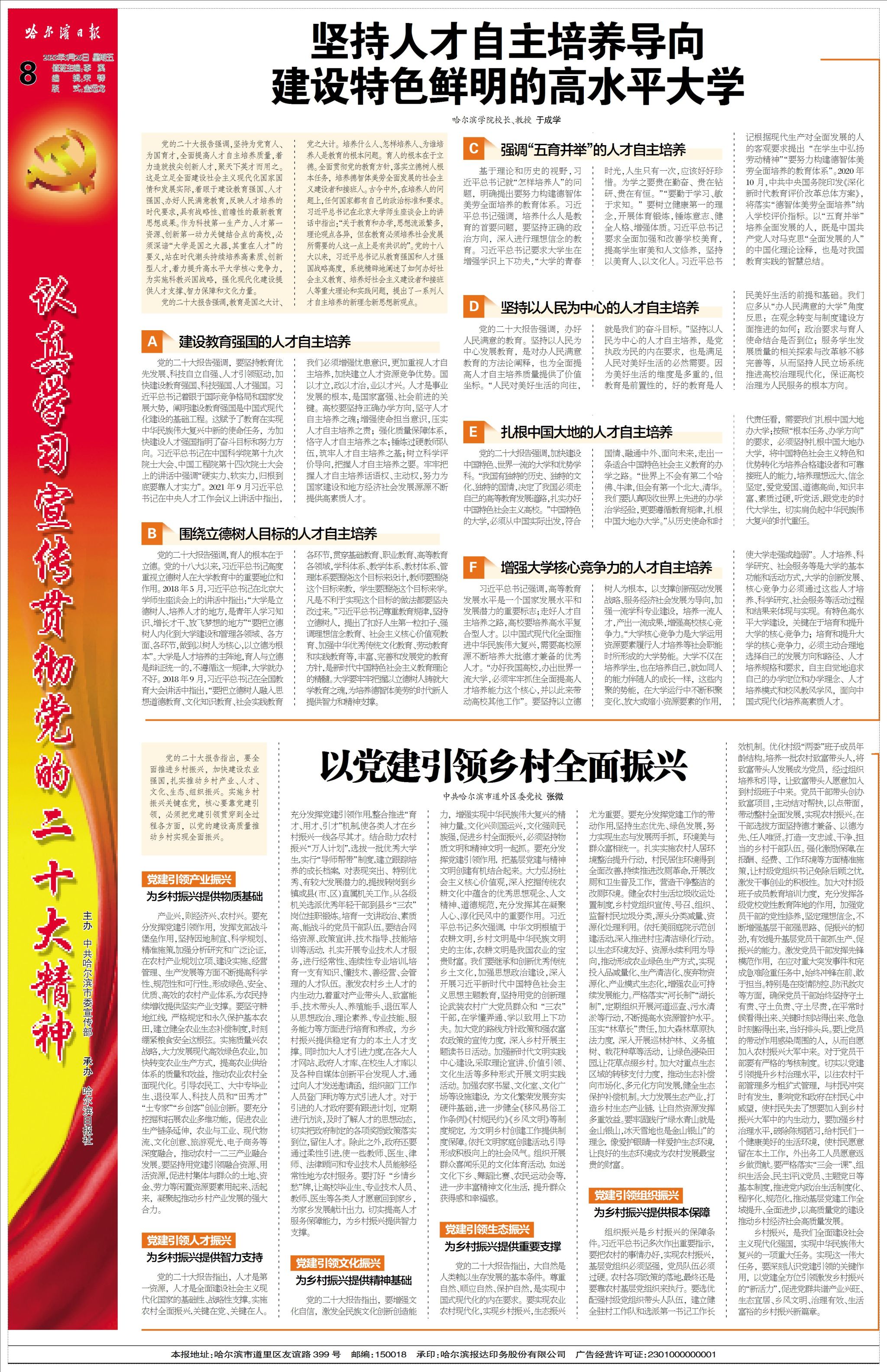 (文/邢珺、李晓欢)今年是全面贯彻落实党的二十大精神的开局之年,也是深入开展学习贯彻习近平新时代中国特色社会主义思想主题教育和深化能力作风建设“工作落实年”,更是学校申硕攻坚实现高质量发展的关键之年。5月26日,《哈尔滨日报》刊发于成学校长署名文章《坚持人才自主培养导向 建设特色鲜明的高水平大学》。