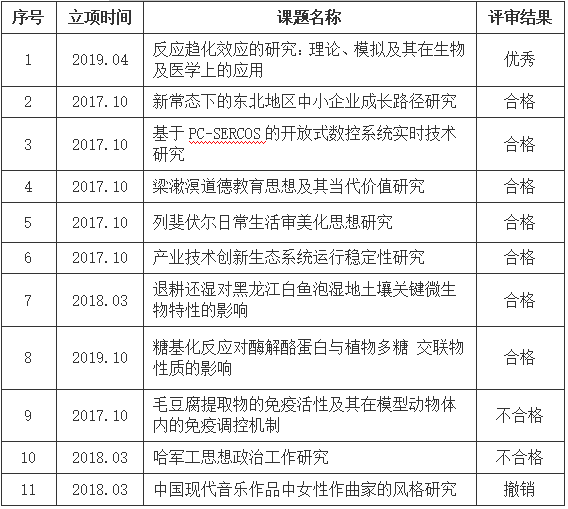 按照《哈尔滨学院青年博士科研启动基金项目实施意见》和《关于已过验收结项期限未结的科研项目处理的通知》等相关文件要求,经审核,本次提交博士科研项目结题共11项,其中,优秀1项、合格7项、不合格2项、撤销1项。