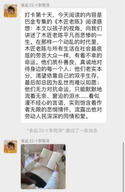 活动以微信群打卡的形式展开,我院学子每天定时发布读书内容及读书心得,帮助带领中小学生精读好书,从书中获取知识,养成良好的阅读习惯。