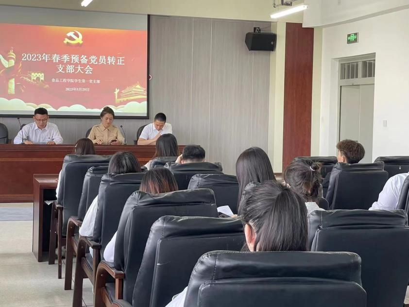 食品工程学院学生第一、第二党支部于2023年5月29日召开2023年春季学期预备党员转正大会。食品工程学院学生第一党支部书记侯成成、学生第二党支部书记张丞宇、21级辅导员姚来斌、22级辅导员幸辰、辅导员金玉宝及我院全体学生党员、预备党员参加党员大会。