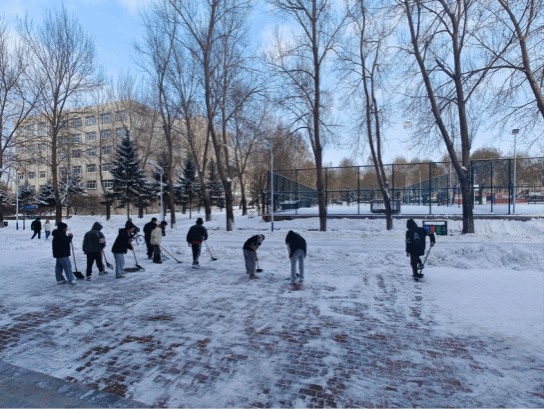根据积雪的堆积情况,划定清理区域,组织了各班级的学生据事先分配的区域,拿着铁铲和扫帚等工具,有序地清理积雪。同学们相互配合和协作,共同完成清雪任务。