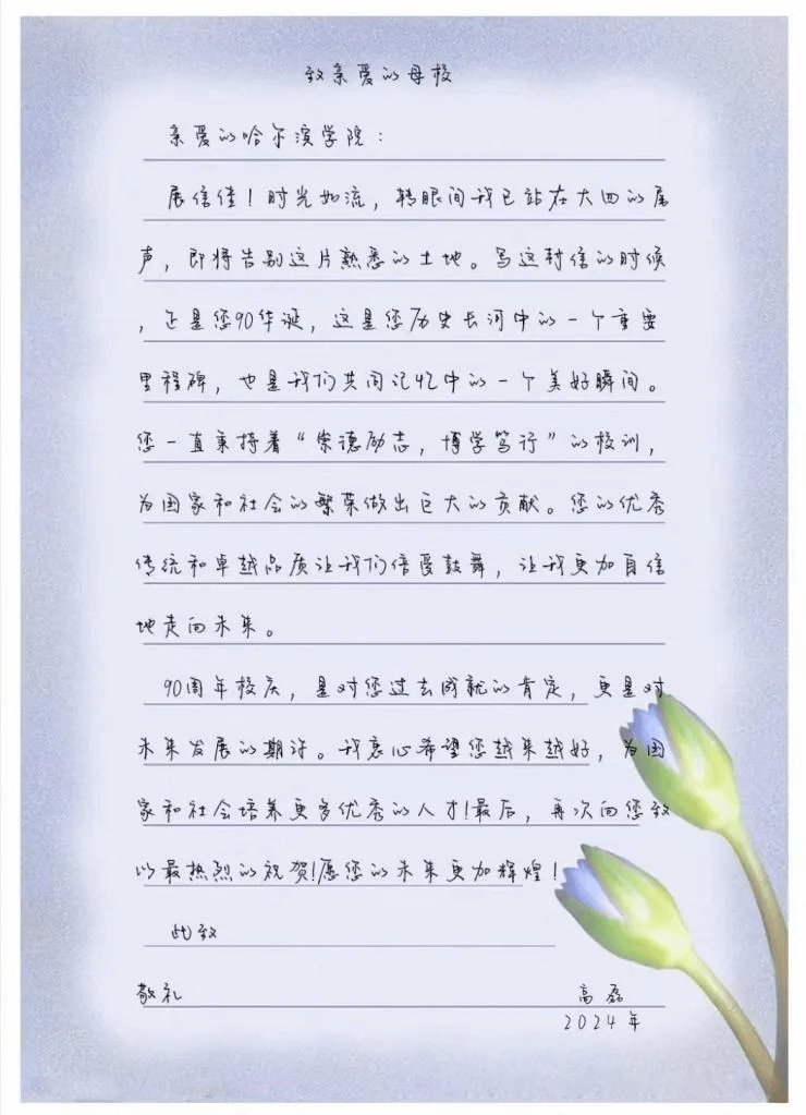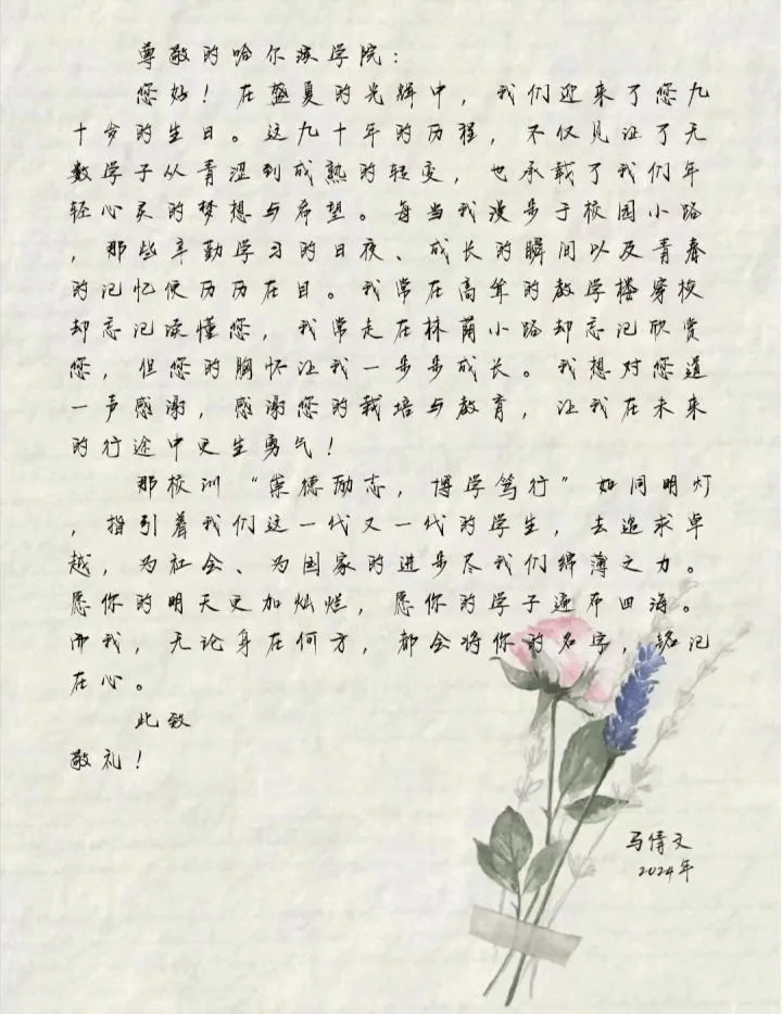 昔日,食品学子们怀揣着满腔的梦想与憧憬踏入了哈尔滨学院的校门,用不懈的勤奋和坚定的努力在青春的岁月里留下了成长的足迹,在人生的画布上绘制出了一幅幅绚丽的画卷,他们用心书写着自己与母校共同度过的青春岁月,回忆着在食品工程学院学习生活的点点滴滴,每一封情书都充满了对母校的感激之情,以及对母校建校90周年的祝福。