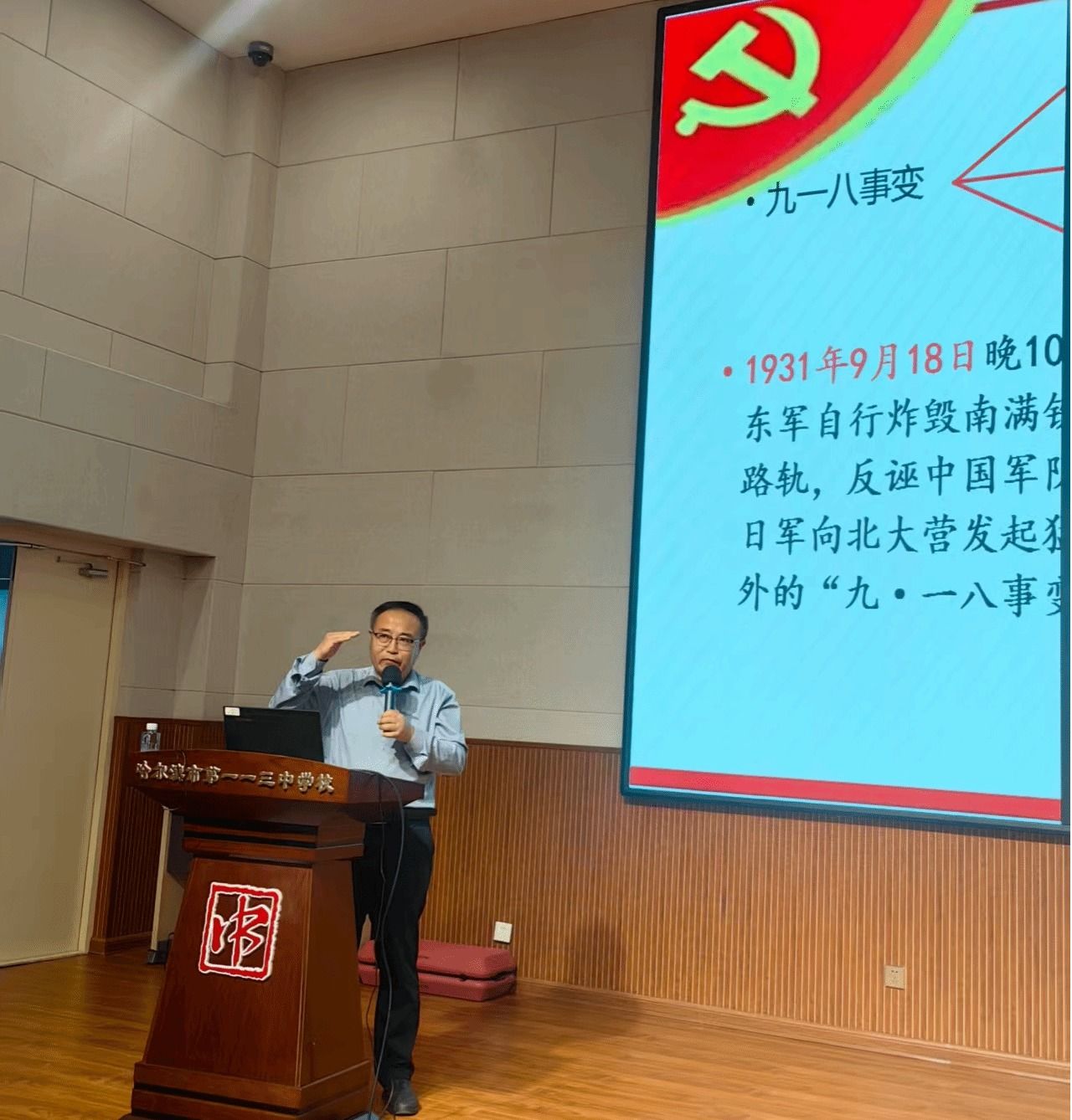9月18日下午,李德刚副院长应邀前往第113中学给学生作题为《勿忘国耻,努力学习,强我中华》的科普讲座。这是黑龙江省东北抗联精神与红色育人研究学术交流基地的系列科普讲座之一,也是马克思主义学院与第113中学合作,共同推进大中小学思想政治教育一体化建设的一项活动。第113中学党委书记李立新、副校长吴娜出席了本次活动。第113中学初中二年级全体学生和部分教师,及正在实习的马院学生共计400人参加了本次科普讲座。
