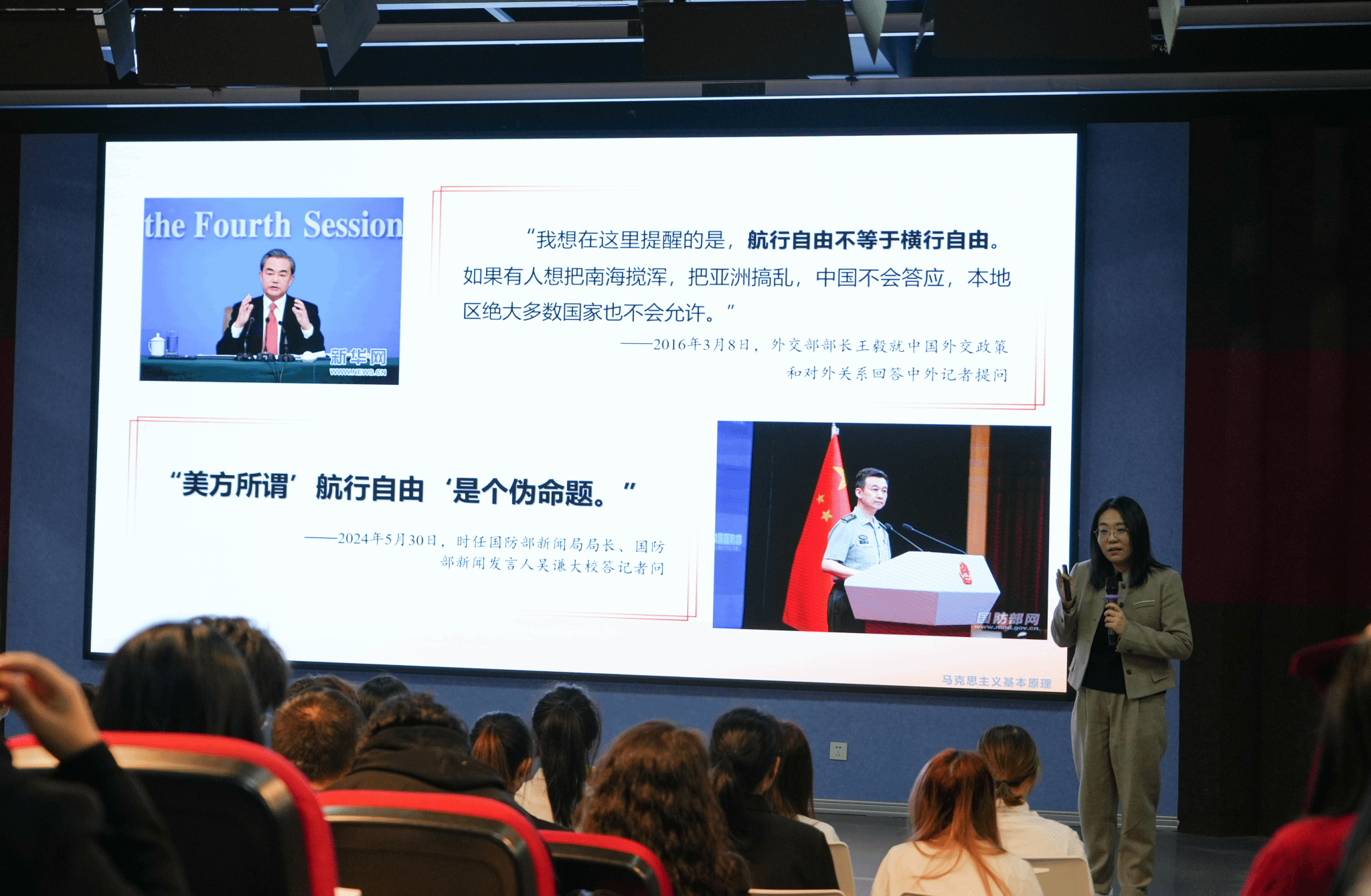 哈尔滨工程大学的关恒老师,围绕《马克思主义基本原理》课程,以《打破幻象:资本主义意识形态的批判与摒弃》为题作示范讲解。关老师通过分析“美方航行自由”的伪命题入手,通过析幻象之本、破幻象之谬、立真实之基的逐层深入分析,将抽象的原理具象化,借助学生关心关注的问题梳理理论逻辑,让原理课真正“落地生根”。
