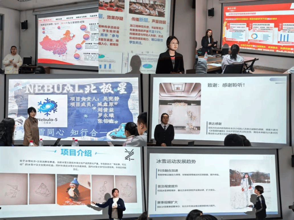 本次选拔赛共有7支队伍参赛角逐。大赛立足龙江特色,聚焦冰雪经济发展,各参赛团队围绕冰雪研学、文创研发、实景娱乐等领域展开了创新探索。在“5分钟路演+3分钟答辩”的赛制下,各团队通过PPT演示与现场解说,以详实的数据与创新的方案,立体呈现了将冰雪资源有效转化为发展优势的实践路径。项目构思新颖务实,视角精准独到,充分彰显了马院学子扎根龙江、服务发展的创新思维与实践担当。