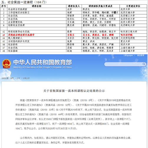 2020年10月30日,教育部公布首批国家级一流课程评审认定结果,我校马克思主义学院安慧玉、吴卫东、周惠杰、孙芳、顾博课程团队申报的《思想政治理论课实践教学》课程,被认定为首批国家级社会实践一流课程。这是我校课程建设取得的首个国家级成果,标志着我校一流课程建设开始跻身国家级行列。