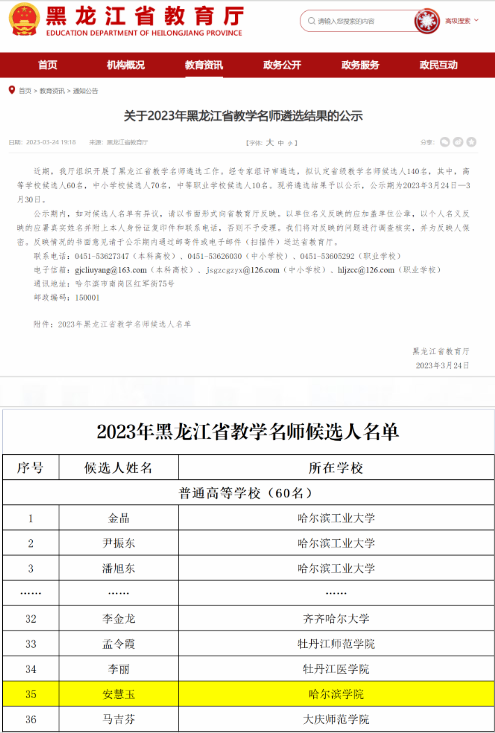 近日,黑龙江省教育厅发布了《关于2023年黑龙江省教学名师遴选结果的公示》,我校安慧玉教授被认定为2023年黑龙江省教学名师。