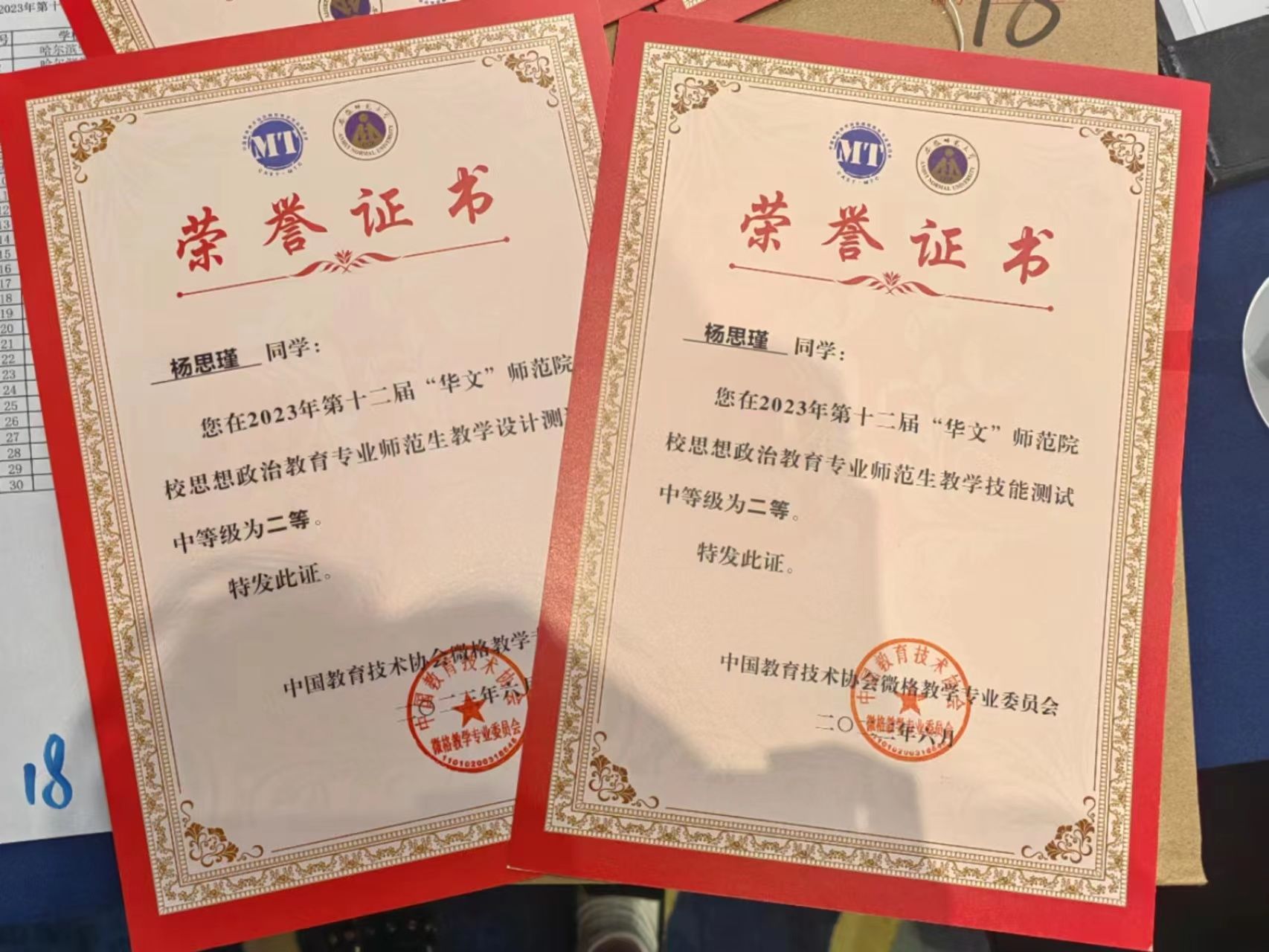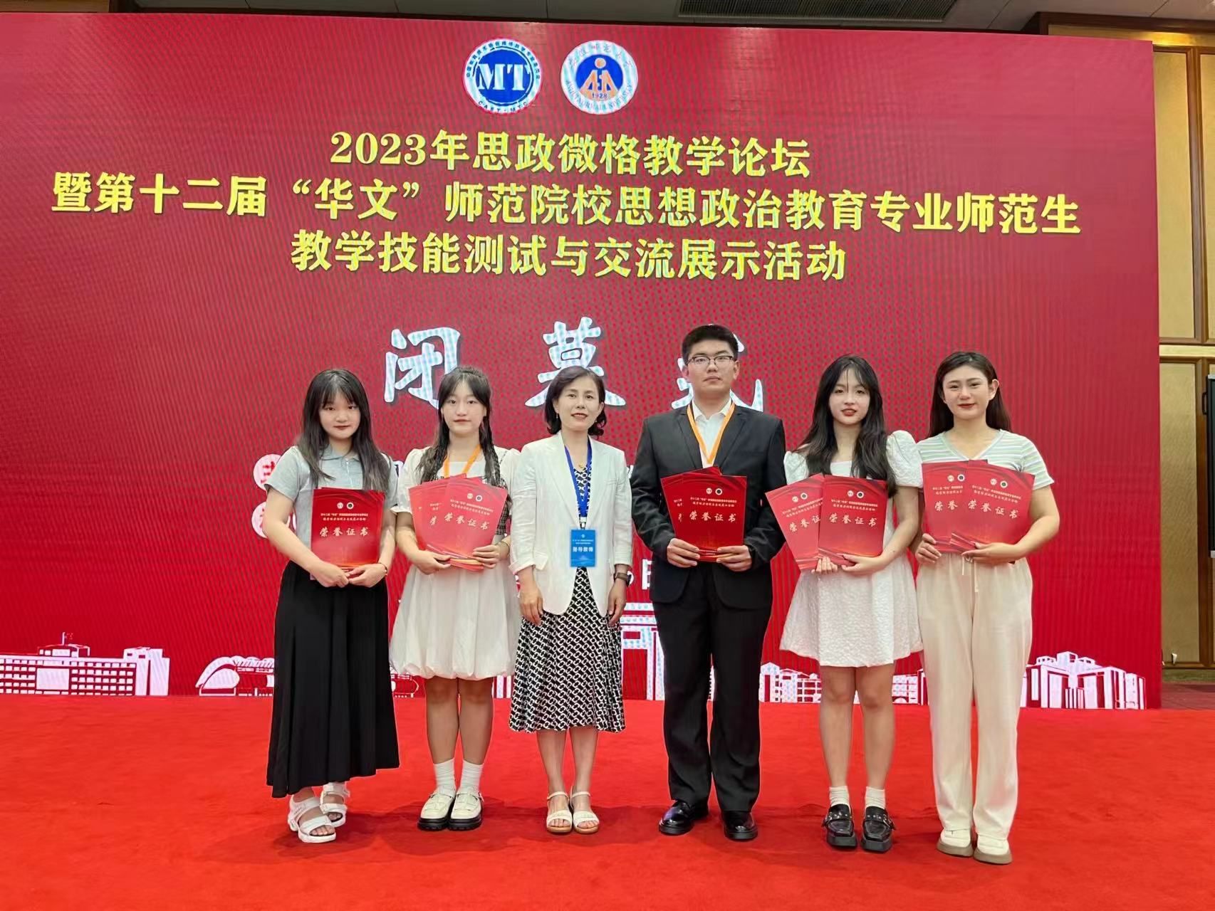 我校马克思主义学院选派的思想政治教育专业2021级王嘉祺、杨思瑾、宗雨晴、俞婕、张宇婷5名同学在指导教师吴冠男、冯引的悉心指导下,经过教学设计、说课、模拟授课、现场答辩等环节的激烈角逐,表现出色,一举收获3个教学设计二等奖、2个教学设计优秀奖;1个教学技能二等奖、3个教学技能三等奖和1个教学技能优秀奖。