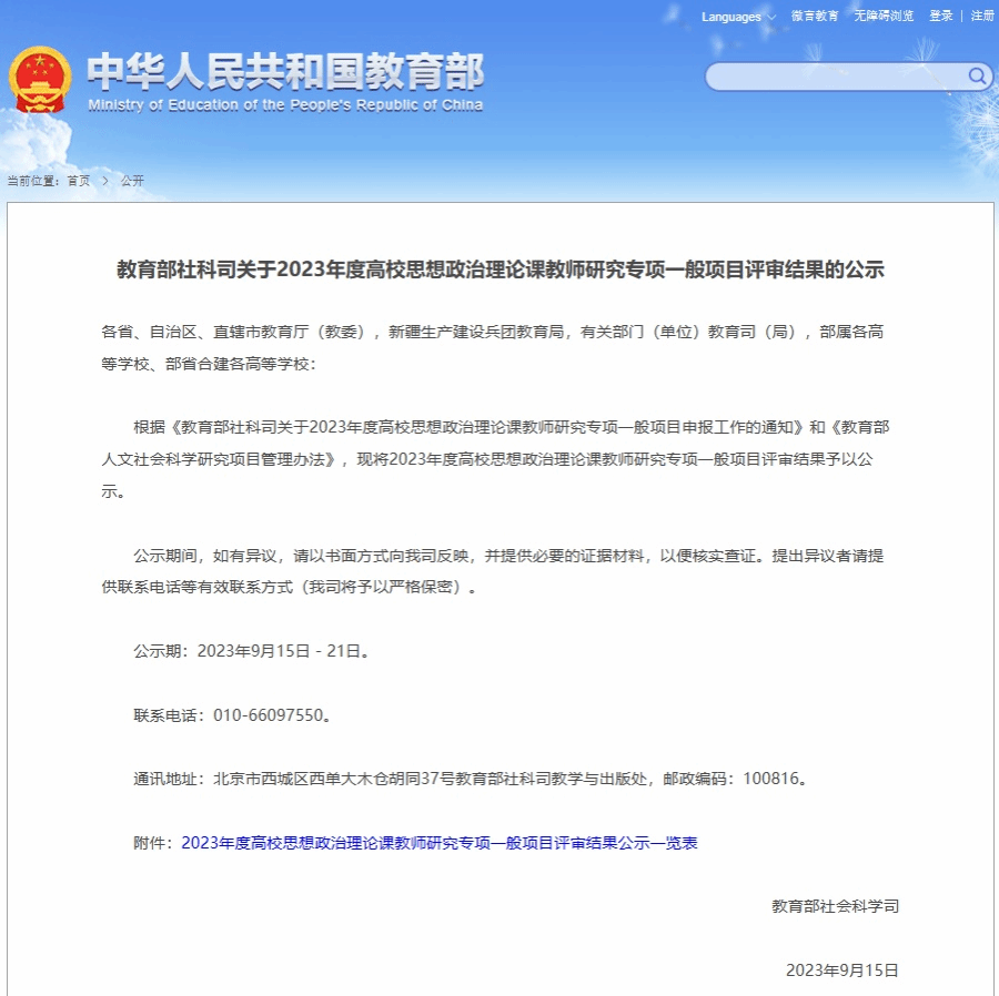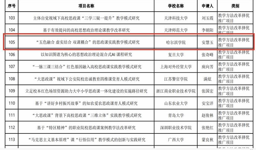 近日,教育部社科司公示了2023年度高校思想政治理论课教师研究专项一般项目评审结果。马克思主义学院安慧玉教授主持申报的《“五色融合 虚实结合 双课耦合”的思政课实践教学模式研究》课题获批“教学方法改革择优推广类”项目立项,该类别项目全国共获批20项,我省仅有1项。此类项目是教育部在“高校哲学社会科学繁荣计划专项”中设立的高校思政课教师研究专项,纳入教育部人文社会科学研究项目。