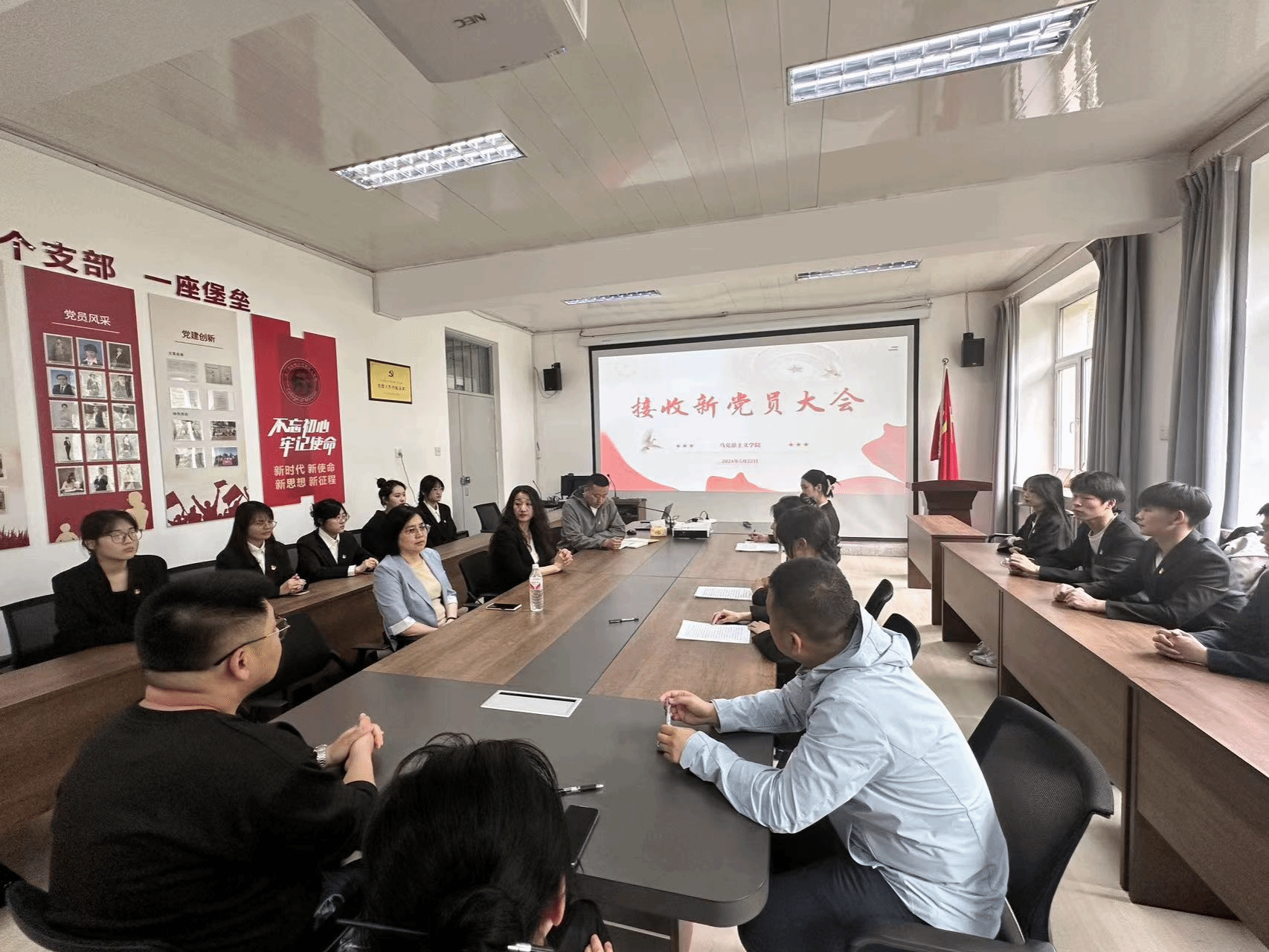 接收新党员大会是马院党组织建设的重要内容,2名同志光荣入党,马院学生党支部又添新力量、新血液。希望2名同志铭记入党时的铮铮誓言,在学习、工作和生活中处处起先锋模范作用,争取早日成为一名合格的中共党员。