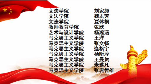 奋进强国路,阔步新征程。演讲之声不绝于耳,强国之音掷地有声。经历三小时的激烈角逐,初赛走向尾声。评委们秉承公平、公正、公开原则,从专业领域全方位、多角度、深层次对选手进行打分点评,最终来自文法学院、教师教育学院、艺术与设计学院和马克思主义学院的12位选手经过层层选拔,脱颖而出成功晋级决赛。晋级名单如下: