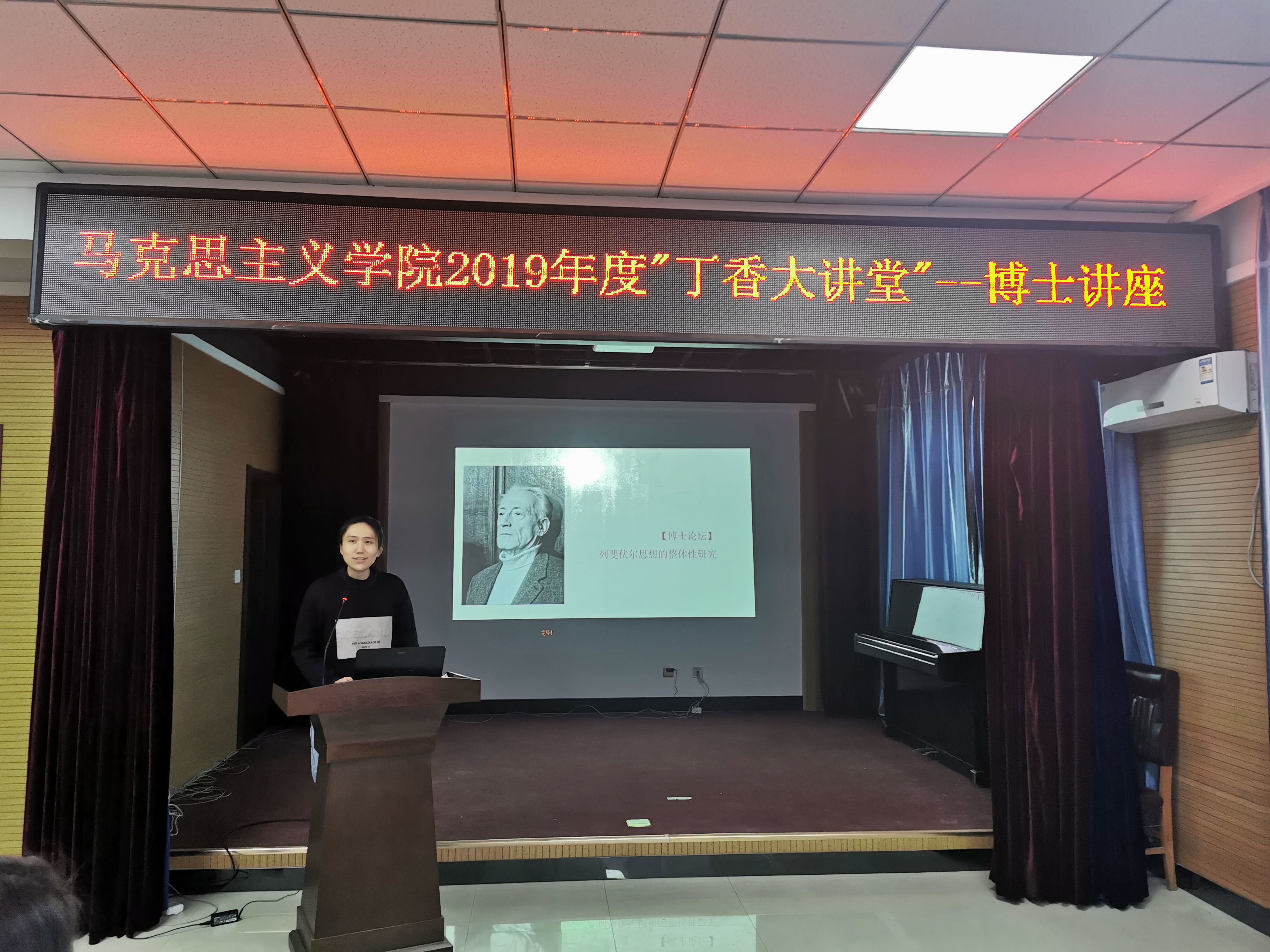 为响应学校关于“营造浓厚学术氛围,举办高水平、高层次学术讲座,开展多种形式的学术交流活动”的要求,12月11日下午,由科技处、马克思主义学院及习近平新时代中国特色社会主义思想研究中心共同举办的2019年度“丁香大讲堂”博士讲座,在马克思主义学院“中国特色社会主义理论培训基地”5412室举行。讲座由马克思主义学院副院长宋阔主持,马克思主义学院党总支书记孙芳、副院长周惠杰和学院部分教师及2017级思想政治教育专业学生百余人共同聆听了此次讲座。