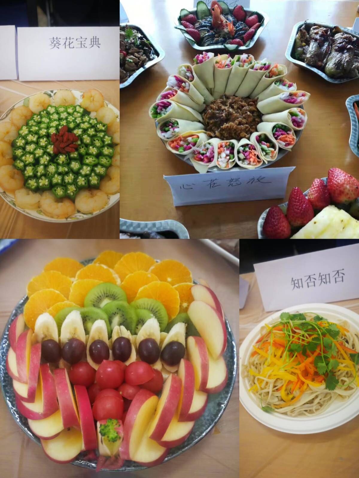 确定方案后,全院女教师分为四组,由组长带队开会研究菜品特色及品类,随后采购食材,分工到人。直至到展示现场前,各组菜品以成品状态待命,到展示现场后摆盘设计,放至各组所在展示区域,等待活动正式开始。