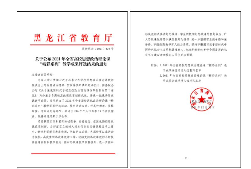日前,黑龙江省教育厅举办的2021年全省高校思想政治理论课“精彩系列”教学成果评选结果正式公布。马院共有9项个人作品和1项团队作品入选,取得了历史空前的好成绩,获奖总数居于全省高校前列,充分展示了我院思政教师的水平与风采,为学校争得了荣誉。