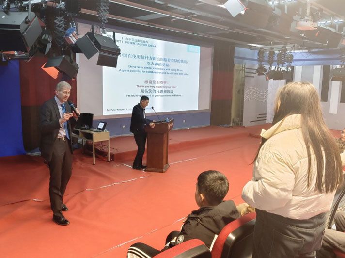 Peter kogler教授以其深厚的学术造诣和幽默风趣的讲解风格,将秸秆生物质材料的奥秘娓娓道来。Peter kogler教授详细介绍了秸秆的生物质特性及其在农业生态系统中的作用。他强调,秸秆作为农作物的主要副产品,富含有机物质和营养成分,是一种宝贵的可再生资源。在正确的利用方式下,秸秆可以作为有机肥料、饲料、生物能源等多种用途,对于提高土壤肥力、减少化肥使用、改善农业环境等方面具有显著的作用。他深入浅出地介绍了秸秆生物质材料的特性、应用前景以及环境和经济效益,让同学们对这一领域有了全新的认识。