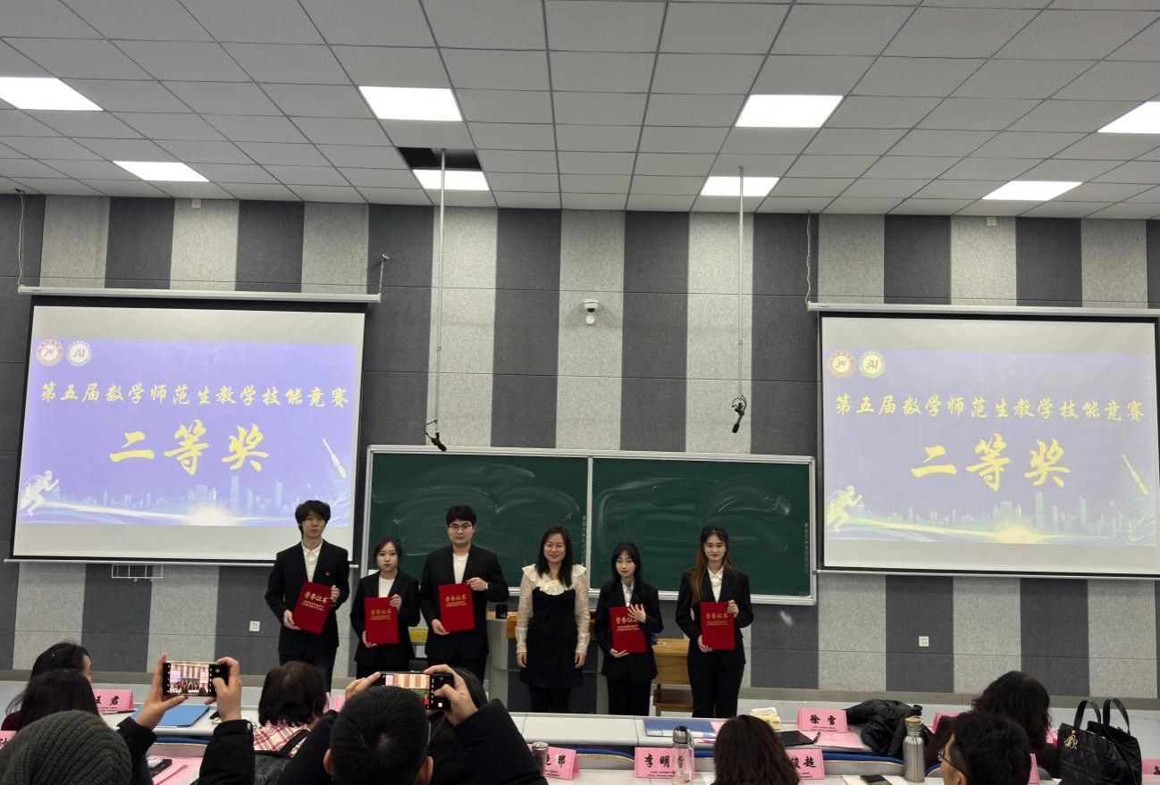 经过激烈比拼,评审团综合教学内容、教学方法、教学素质与教学创新等维度,评选出一、二等奖;三等奖则依据初赛成绩直接产生。赛后,数学系主任王君副教授对选手们的整体表现进行了专业点评,充分肯定了他们在教学设计中体现出的创新意识与育人温度。数学系2025级许多以青春洋溢的歌曲《第一天》代表2024级、2025级同学展现学习师范技能的决心。王知非院长在闭幕致辞中向所有获奖选手表示热烈祝贺,并强调,学院将持续搭建高质量育人平台,深化师范生培养体系改革,引导广大青年学子自觉传承和弘扬教育家精神。他希望全体师范生以此为契机,不断提升教育教学能力,努力成长为有理想、敢担当、能吃苦、肯奋斗的新时代“大先生”。活动最后,学院领导与嘉宾为获奖选手颁发荣誉证书,并合影留念。