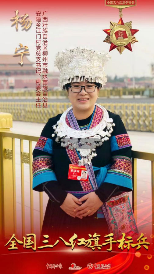 2010年,杨宁大学毕业后毅然回到家乡——国家扶贫开发工作重点县融水苗族自治县的安陲乡江门村,当起了大学生村官,在村里一干就是6年,用心为村里的老人、残疾人、瘫痪病人、留守儿童等解决生活中的种种困难,赢得了群众的真情拥护。2016年,杨宁决定通过网络渠道推广、销售村子里的农副产品,分享大苗山的美食和文化。很快,杨宁和6名大学生村官成立了融水县大学生村官创业联盟,共同建立起“苗村倌”农产品电商服务中心和微信公众号,并通过大学生村官们的微信朋友圈,做起了“微商”。2017年,她被群众一致推选为村委会主任。她全心全意为群众、一心一意谋发展,带领328户贫困户发展高山泉水西瓜、高山水稻等特色产业,并创办了“苗阿嫂”品牌,通过品牌销售农产品,使户均收入增加3200多元。带领农村创业青年成立了“苗村倌”农产品电商服务中心,3年销售贫困户特色农产品900多万元,带领江门村94户326人成功脱贫,贫困发生率从20%降低到0.05%,实现整村脱贫。她在6年大学生村官任期结束后选择留在基层,带领村里94户326人成功脱贫,实现整村摘帽。她带领贫困户发展高山泉水西瓜、高山水稻等特色产业,成立泗维河生态农业有限公司和“苗村倌”农产品电商服务中心,销售农产品900多万元。曾荣获全国三八红旗手、全国农村青年致富带头人、“最美城乡社区工作者”等称号,被授予中国青年五四奖章。