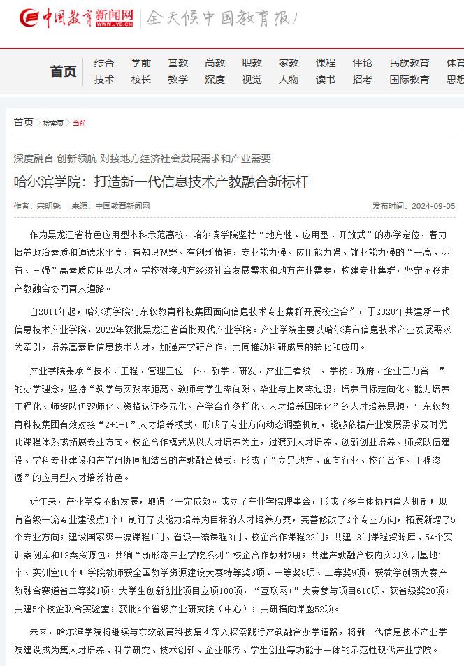 9月5日,中国教育新闻网报道了我院在产教融合方面的创新举措和显著成效,在新一代信息技术领域,打造新一代信息技术产教融合新典范。